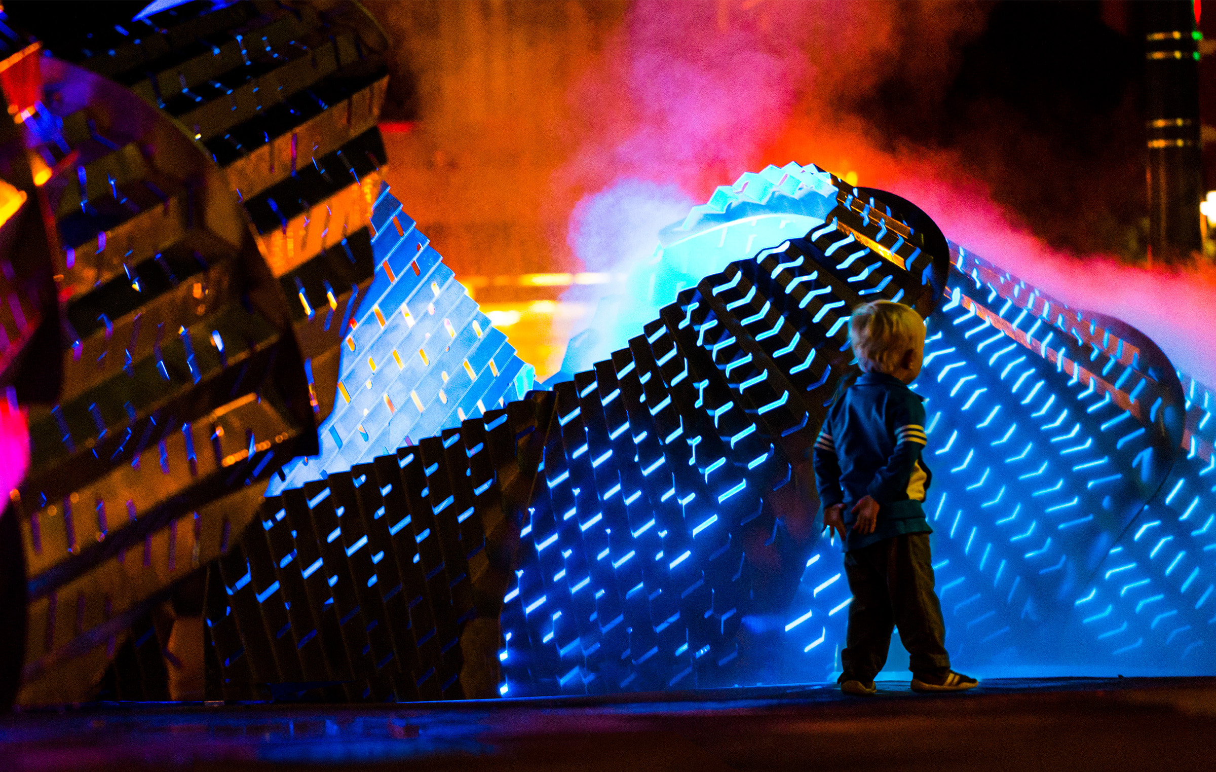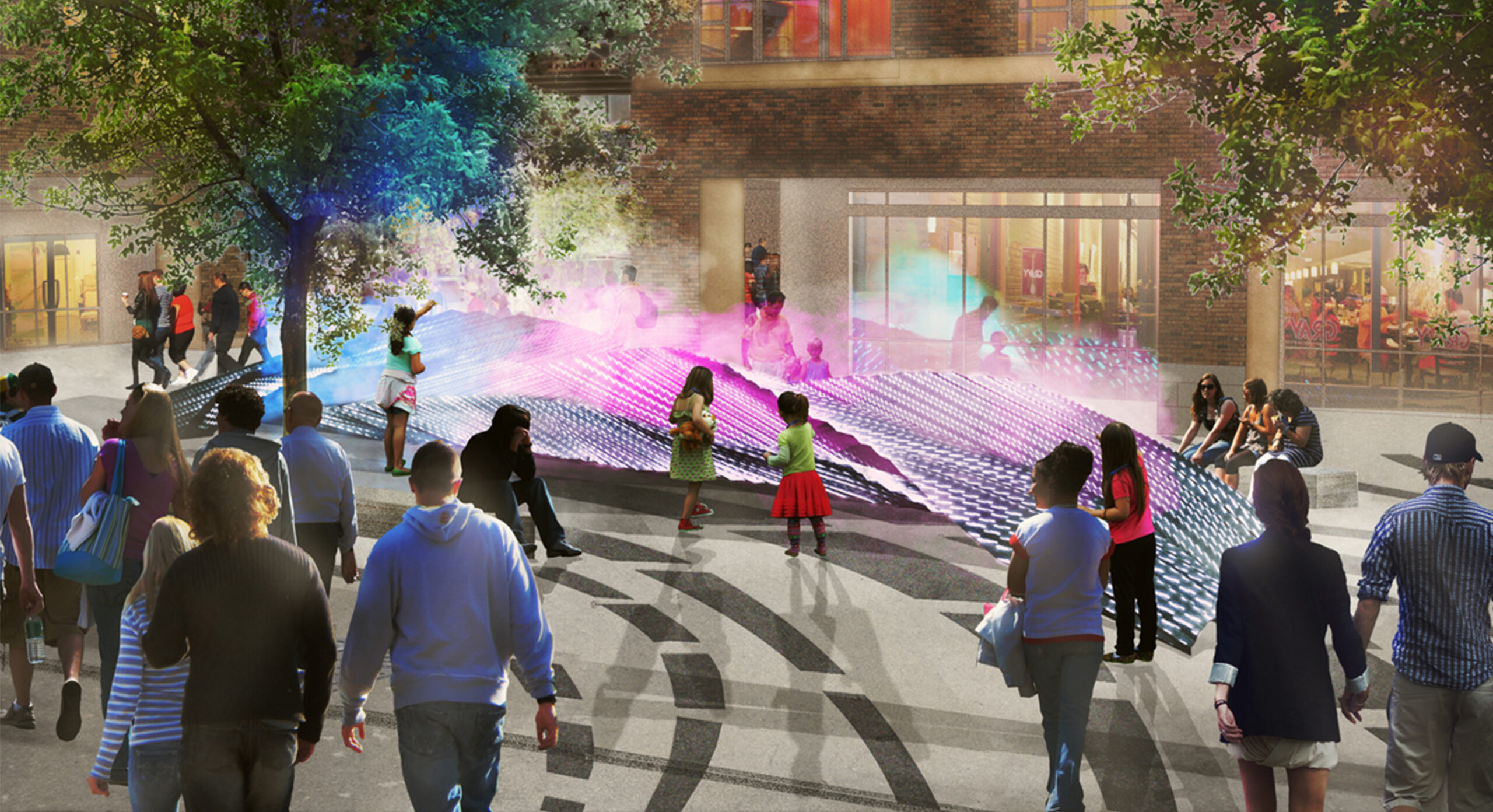 Discovery and play are at the heart of this fountain, inviting the public to engage with its vibrant colors and interactive features, encouraging exploration in this vibrant space.