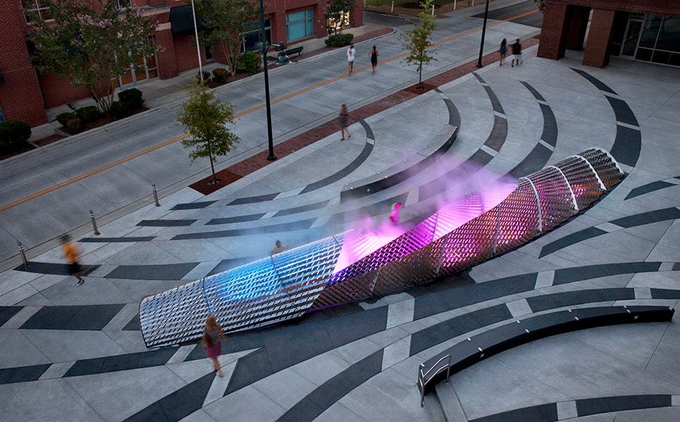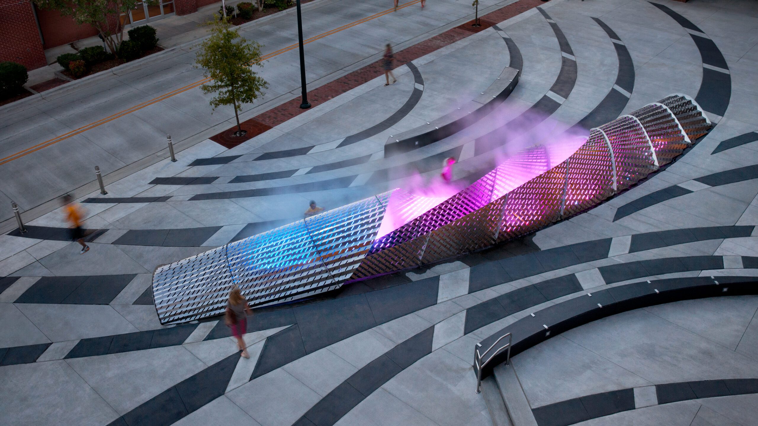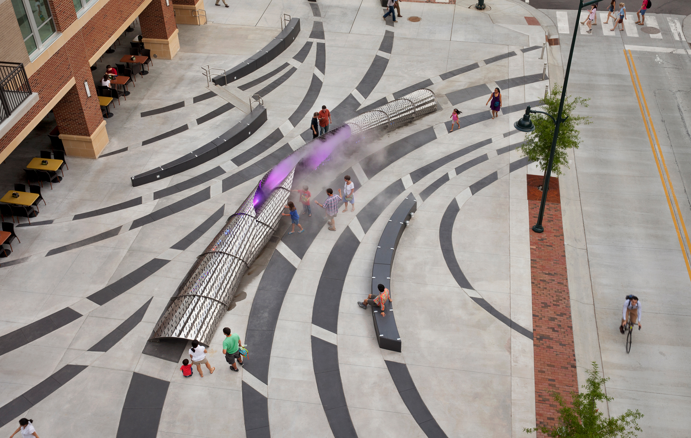 The 140 West Plaza transforms a former parking lot into a vibrant, pedestrian-friendly destination. Enclosed by a mixed-use development that forges a commercial link between North Rosemary Street and the downtown restaurant district, this central gathering space serves as a vital public plaza for recreation and community engagement. At its core, a sculptural mist fountain acts as a dynamic focal point, infusing the plaza with light and color that change with the seasons, creating an inviting and interactive design.