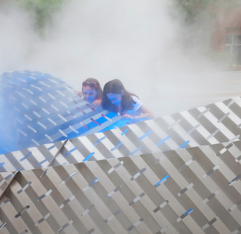 The mist fountain creates a cooling microclimate during the summer heat, while the interplay of water and light offers a dynamic experience that flows from one end of the plaza to the other.