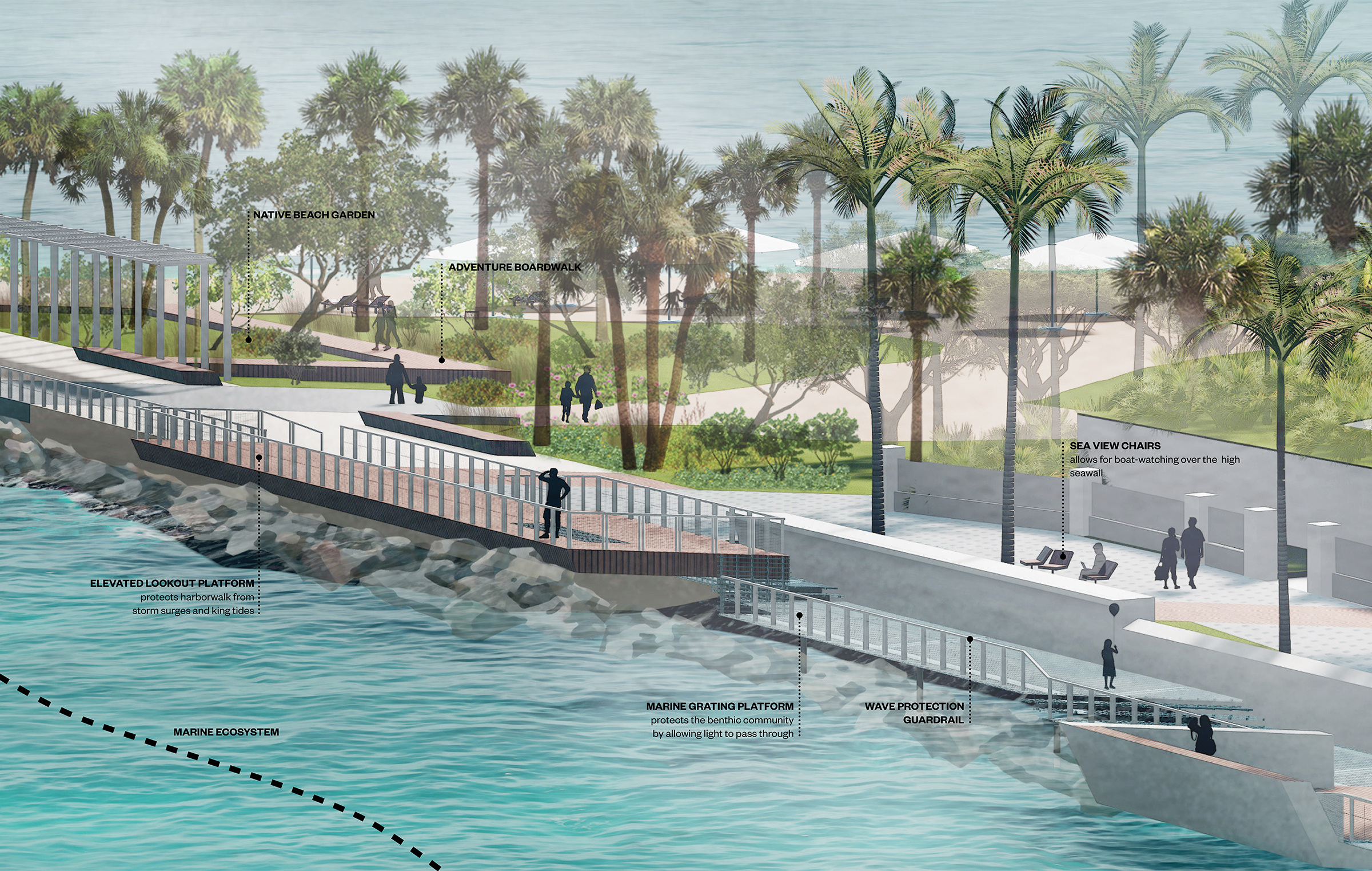 The Bal Harbour Jetty and Gateway design is a cohesive vision for the public spaces within this renowned oceanfront village. The jetty is reimagined to reflect the local history and character, while establishing the essential infrastructure needed to support the area’s vibrant tourism. This phased, multi-year initiative will enhance three distinct areas: the Cut Walk Jetty at the northern edge of the village, which will be upgraded with improved access and amenities; the integration of 96 Street with surrounding streetscapes to facilitate easier pedestrian access to the beach; and the creation of a unique streetscape identity along Collins Avenue, which will transform the existing Herman Fultz Parking Area into a safer and more aesthetically pleasing multi-modal transit hub.