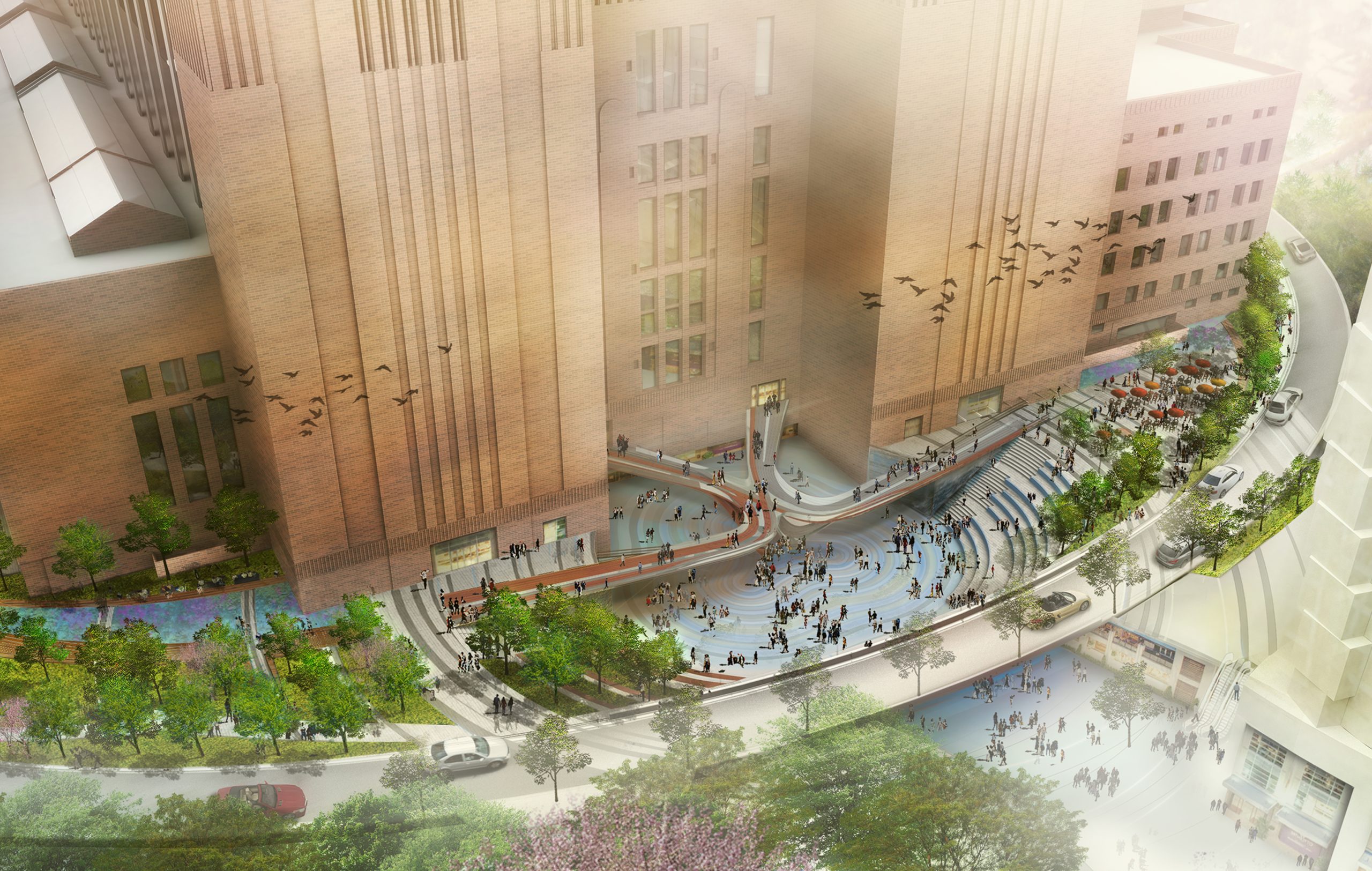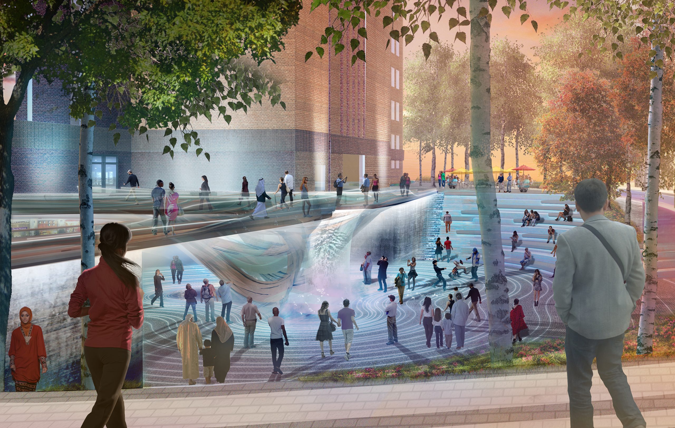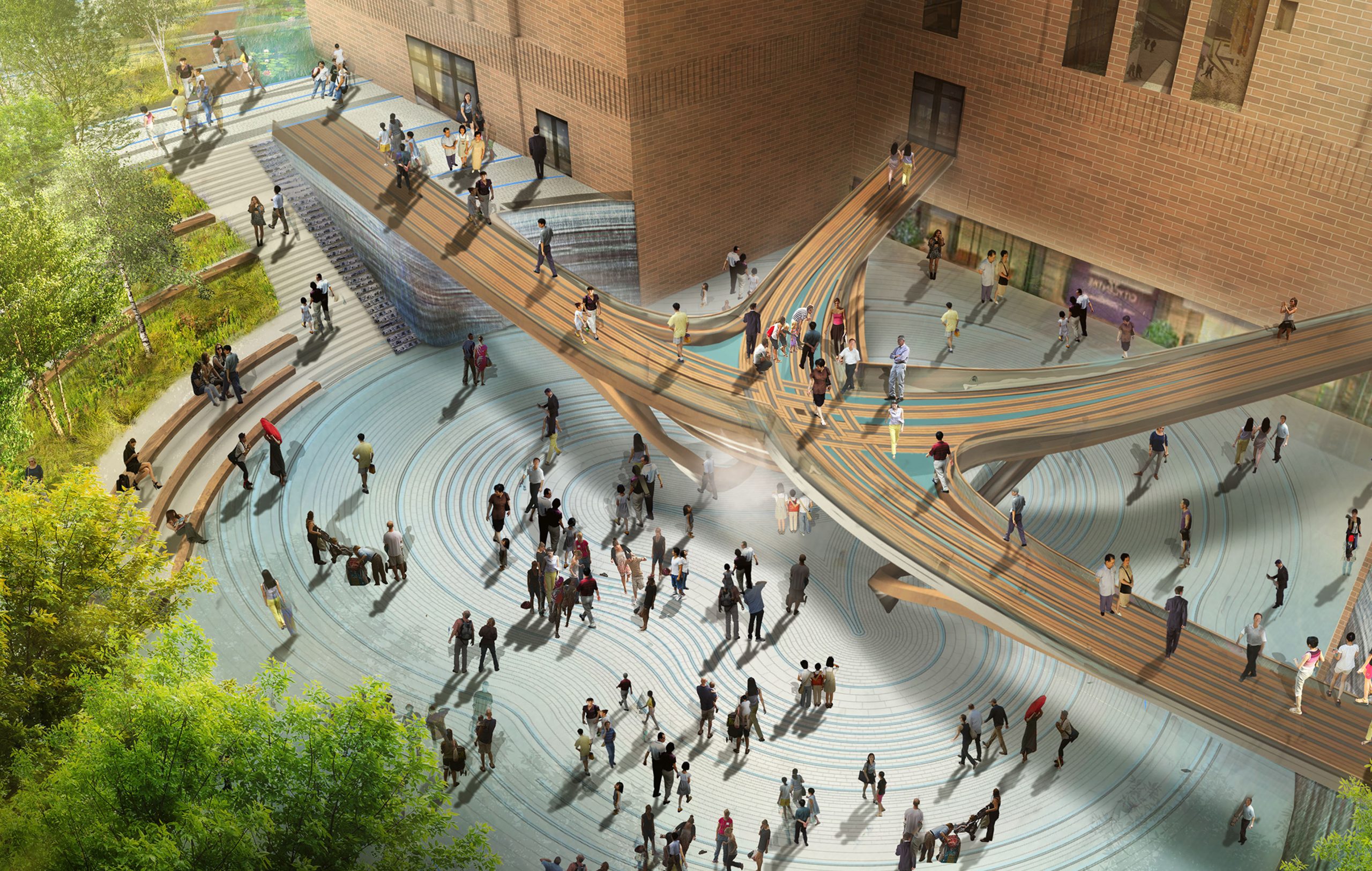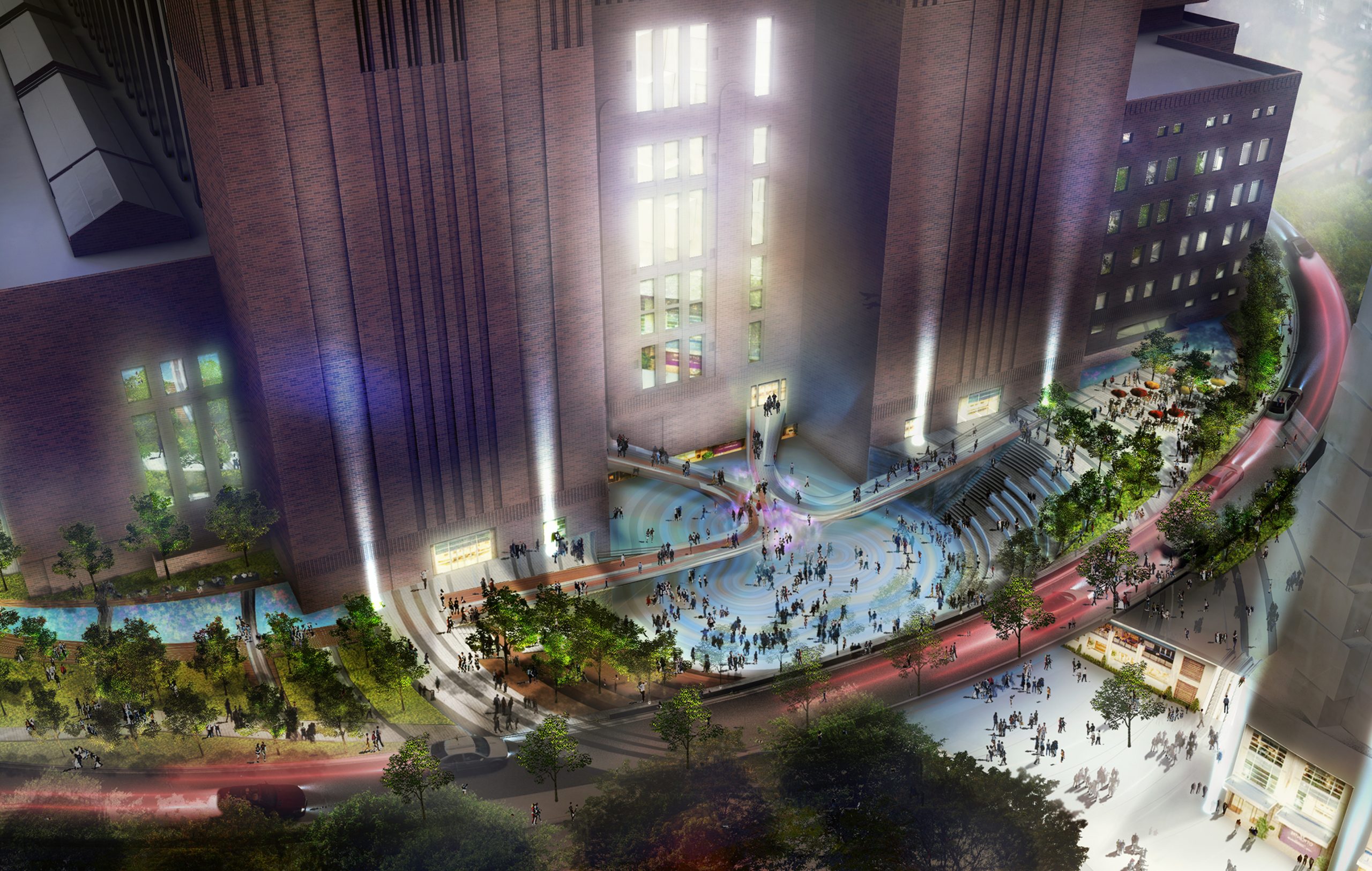 Our finalist Battersea Power Station plan envisions a dynamic and regenerative urban experience by creating a central civic space that seamlessly integrates landscape, art, and architecture. Nestled within this historic setting, a mass timber and steel bridge connects the two upper gardens, celebrating the site’s heritage while serving as an iconic gateway connection the various sides of the site. This bridge frames a mist fountain at the lower plaza level, activating both levels of the plaza, while designing for flexible programming across three distinct landscape zones: the central sunken garden which is flanked by two contrasting spaces – lush rain gardens to the west that focus on biodiversity and sustainability, and a public urban plaza to the east, which hosts cultural activities, outdoor cafés, and markets. Together, these designed rooms come together to create a lively and diverse environment for visitors year-round.