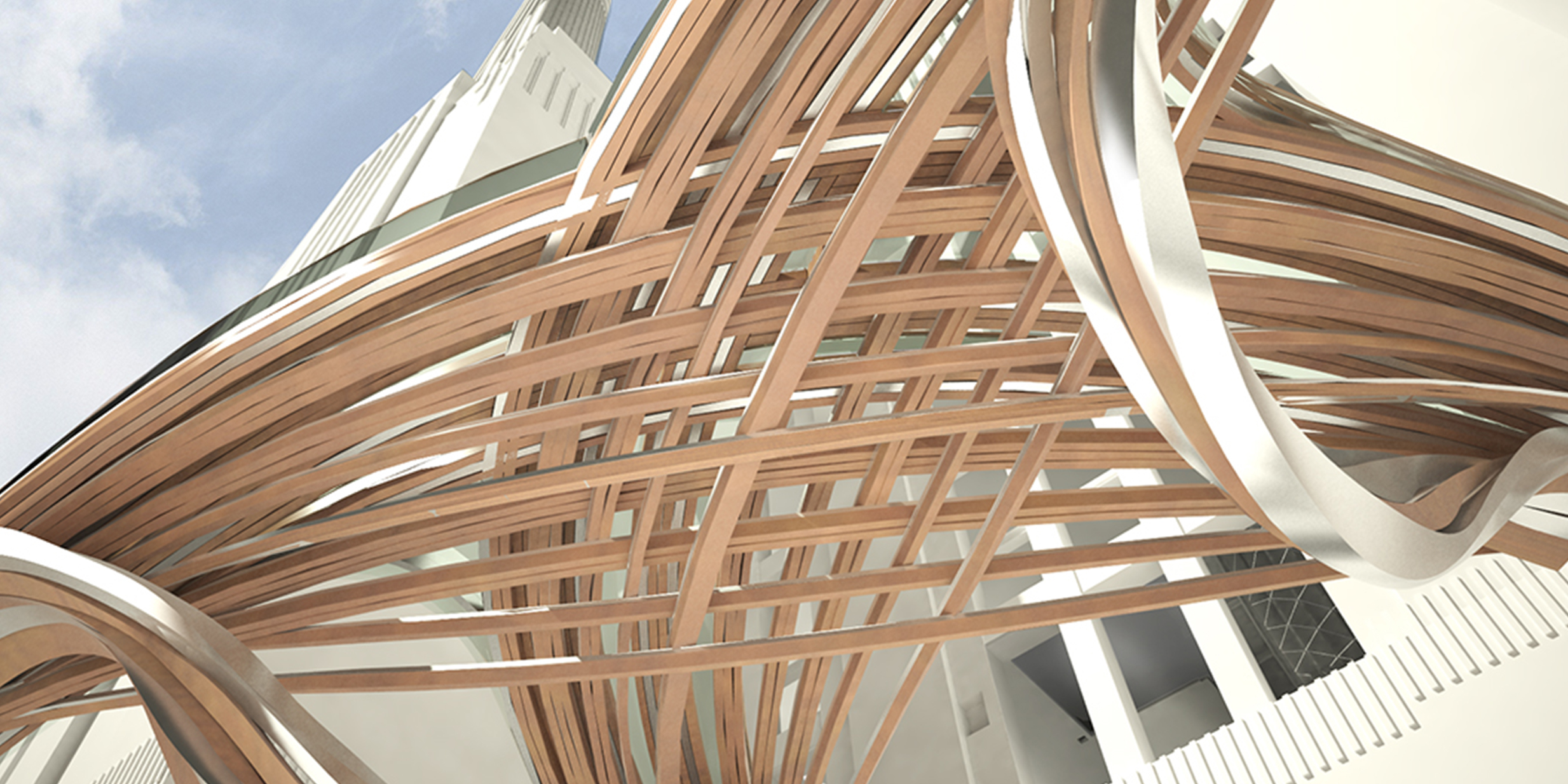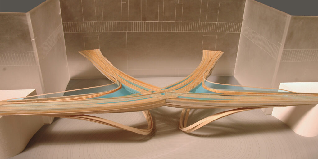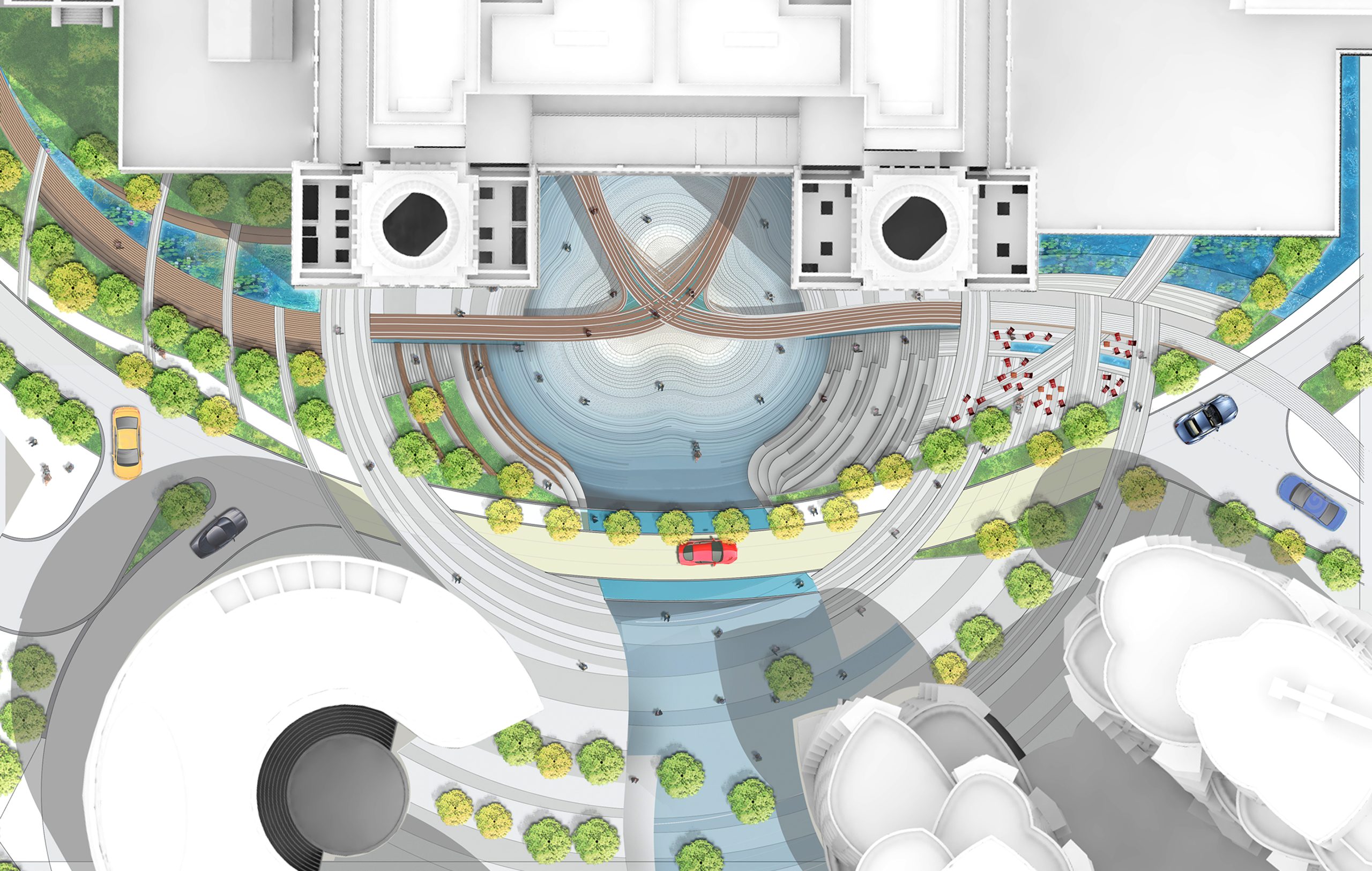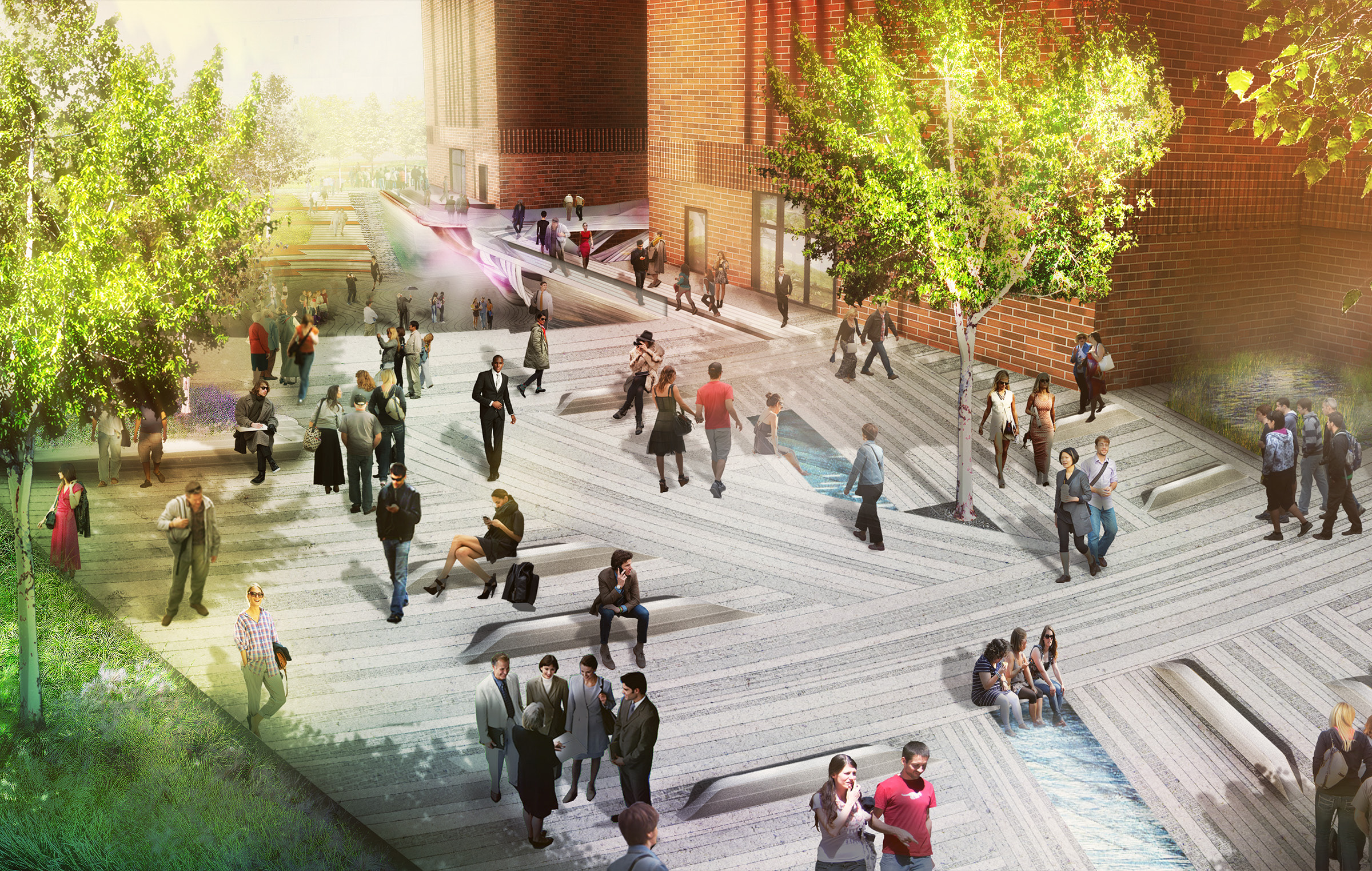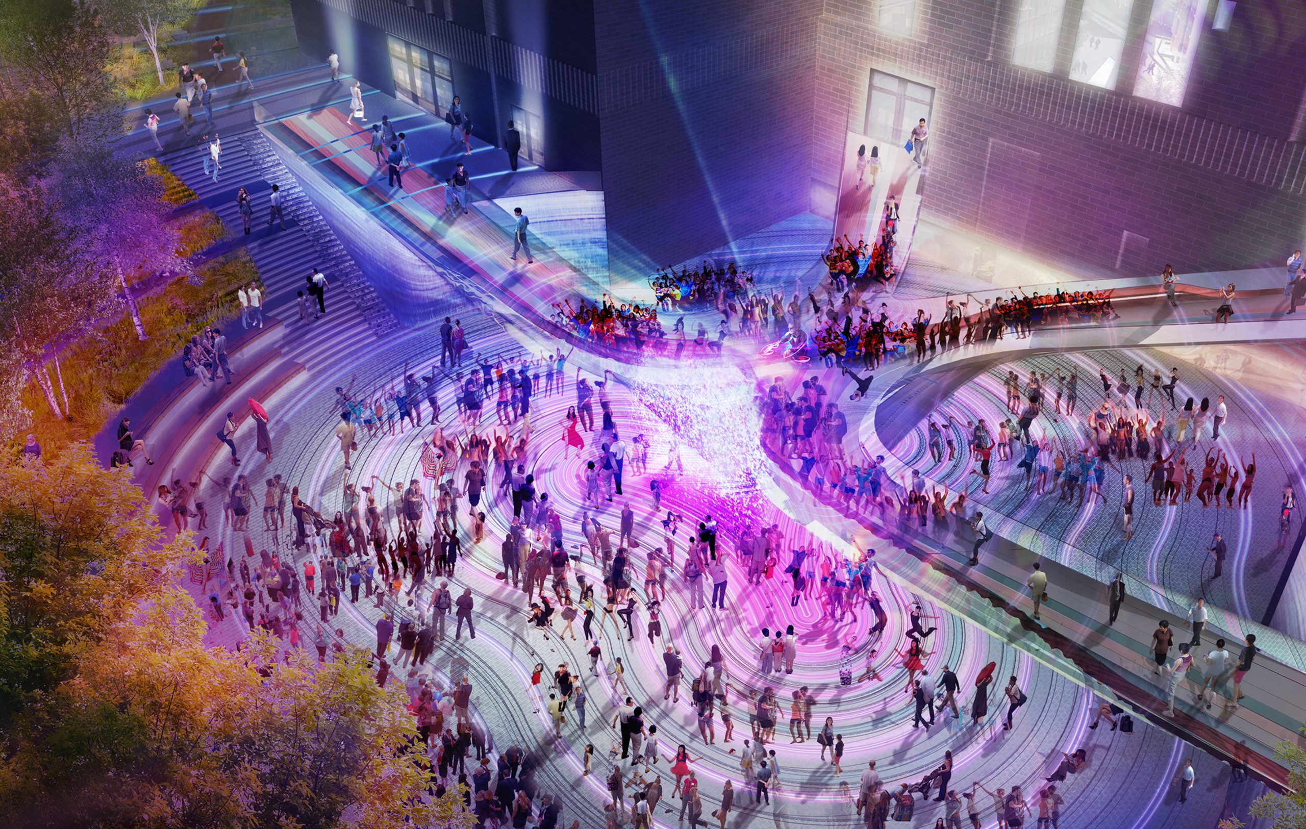 Our finalist Battersea Power Station plan envisions a dynamic and regenerative urban experience by creating a central civic space that seamlessly integrates landscape, art, and architecture. Nestled within this historic setting, a mass timber and steel bridge connects the two upper gardens, celebrating the site’s heritage while serving as an iconic gateway connection the various sides of the site. This bridge frames a mist fountain at the lower plaza level, activating both levels of the plaza, while designing for flexible programming across three distinct landscape zones: the central sunken garden which is flanked by two contrasting spaces – lush rain gardens to the west that focus on biodiversity and sustainability, and a public urban plaza to the east, which hosts cultural activities, outdoor cafés, and markets. Together, these designed rooms come together to create a lively and diverse environment for visitors year-round.