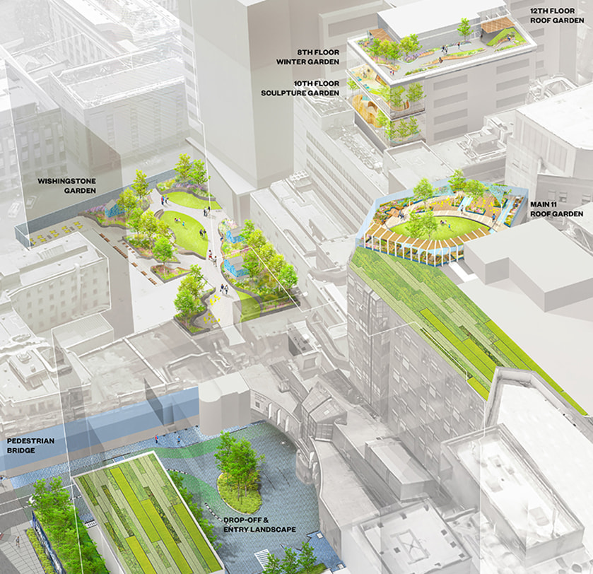 The design is guided by principles of stress reduction and restoration, aiming to reduce patient stays, enhance community, and support staff productivity. Overall, the plan brings the natural world closer to the hospital experience, supporting emotional, cognitive, and physical well-being for all.