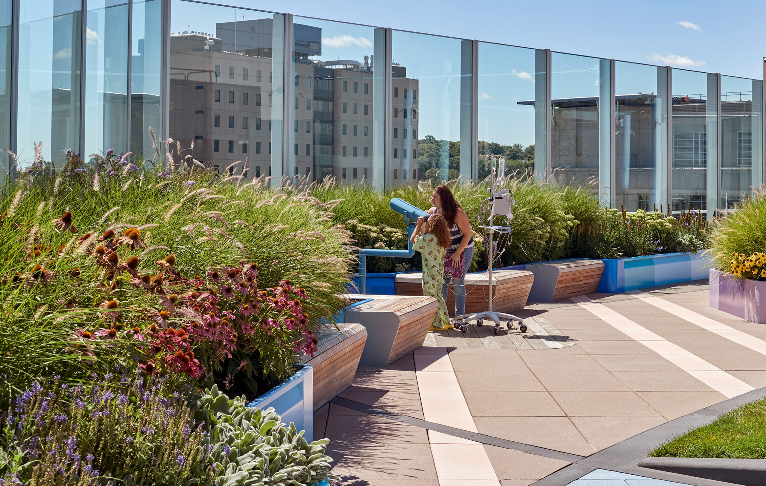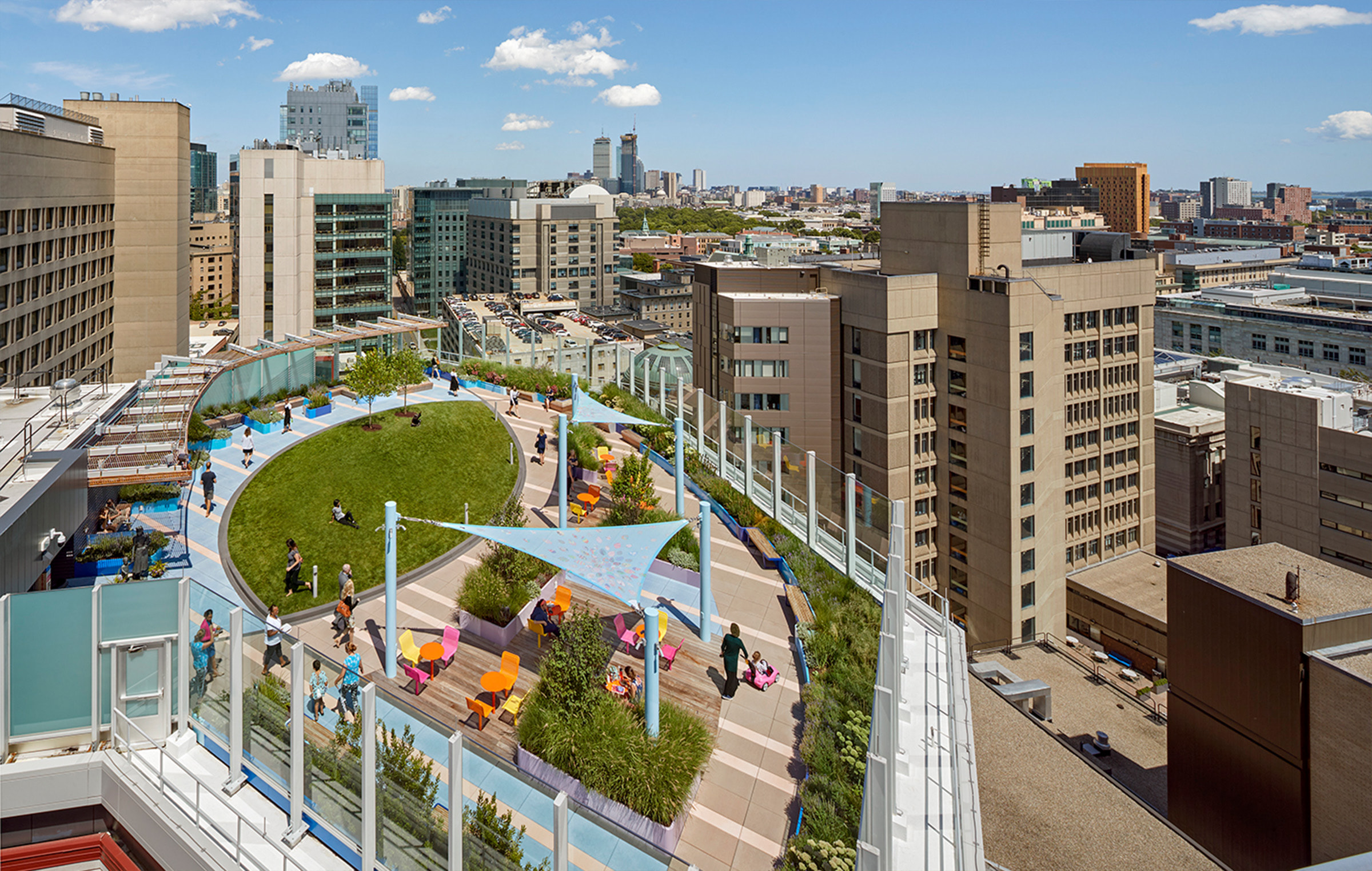 As part of the main campus for Boston Children’s Hospital, this central healing garden and entry is designed for patients, families and caregivers to enhance the hospital’s daily experience. The rooftop garden located on the eleventh floor of the hospital’s main building serves as a tranquil refuge with quiet nooks for contemplation. This holistic garden offers breathtaking views of Boston’s skyline and harbor with lush knolls for free play, shaded seating outdoor rooms, and all season biodiverse plantings. The design thoughtfully accommodates children who are immunocompromised and those with disabilities, ensuring an inclusive space for all.