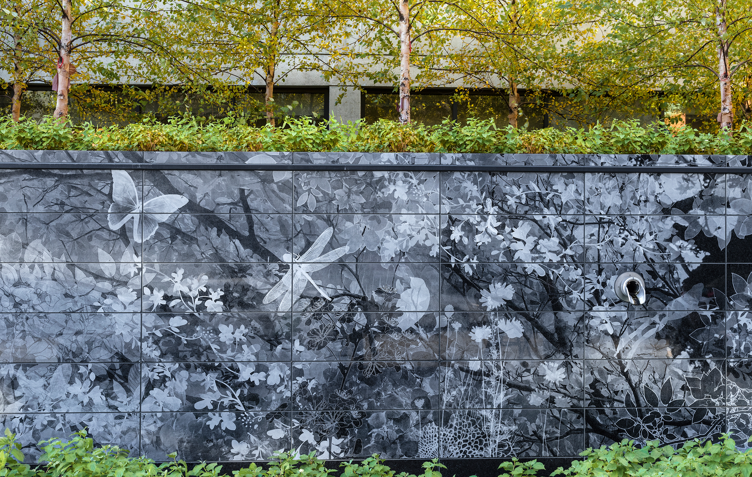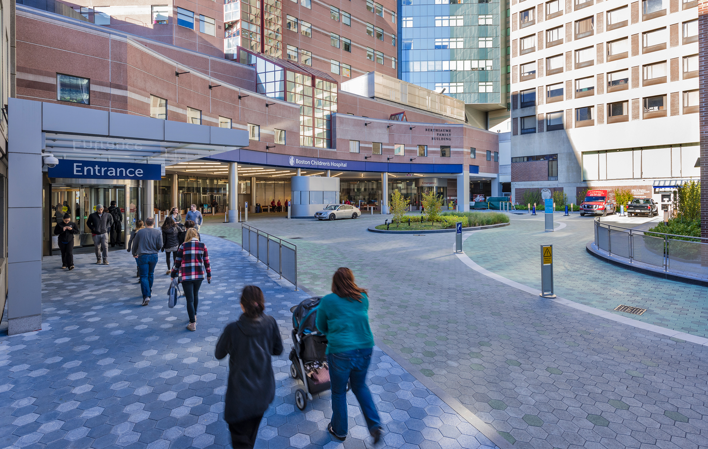 Along Longwood Avenue, a tapestry of green and blue pavers define the entry court, while a grove of birch trees and hedges frame a striking hand painted granite wall, inscribed with local flora and fauna. Together these design elements along with wayfinding signage offer a dynamic display of color and texture that enhances the welcoming atmosphere of this pediatric hospital entry experience.