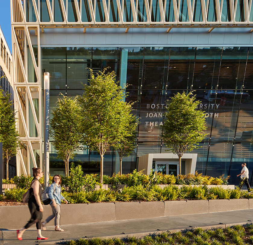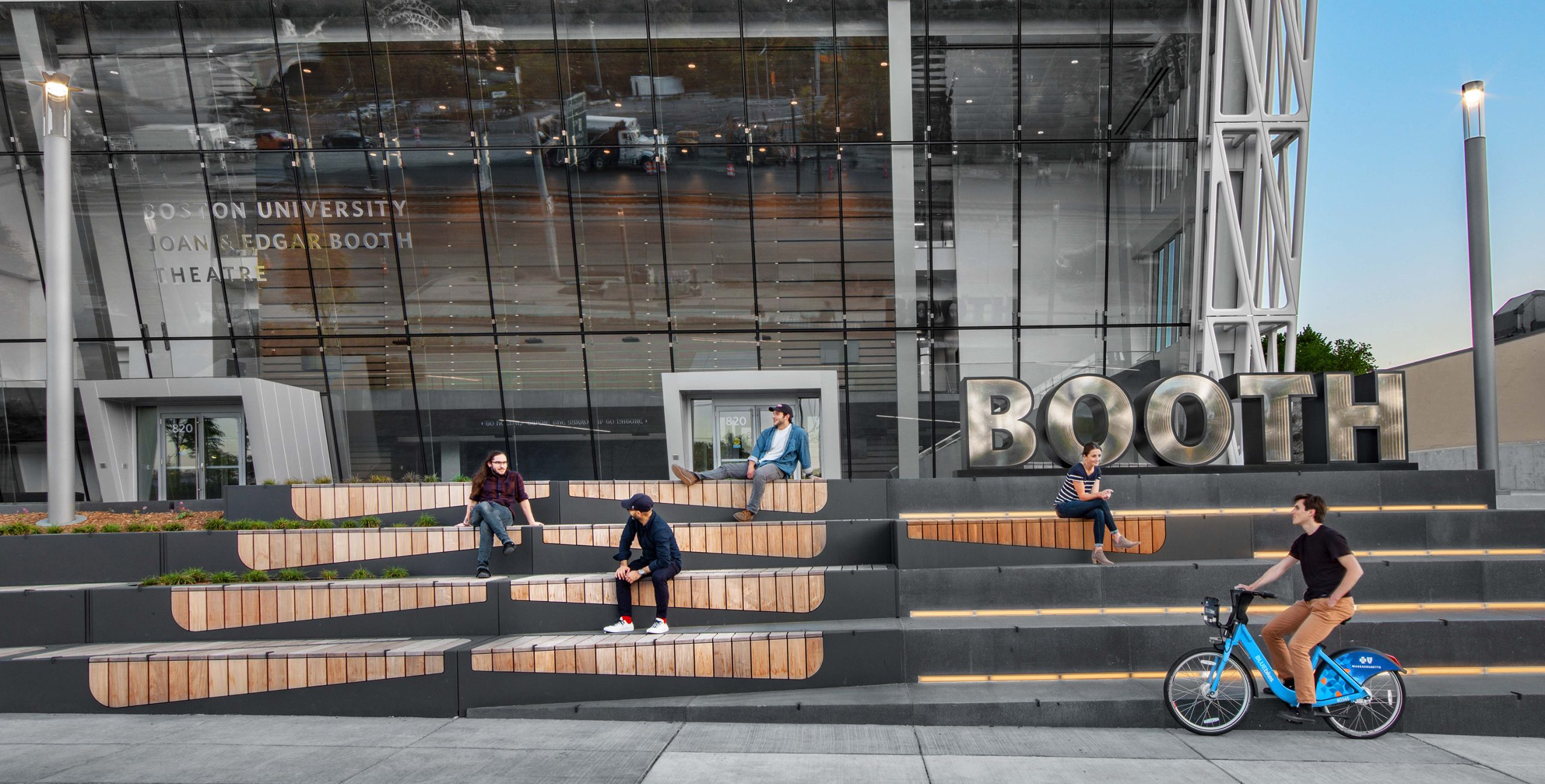 Nestled in the campus arts district, the new Booth Theater Building features a 250-seat black box theater, along with production spaces and classrooms that consolidate the University’s theater department. This modern performance complex provides a variety of outdoor spaces for BU students, faculty, and staff, serving as venues for outdoor classrooms and recreational activities.