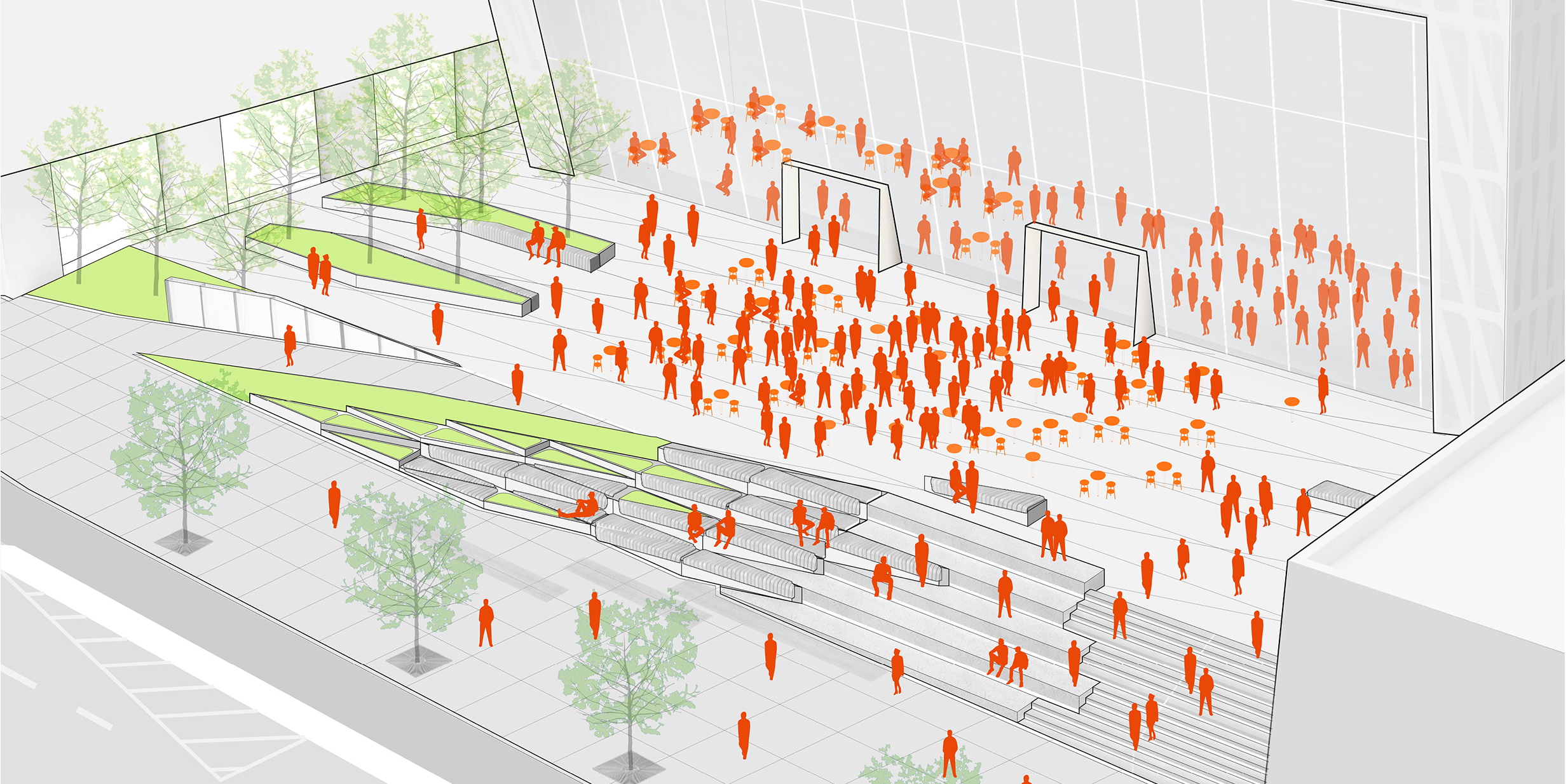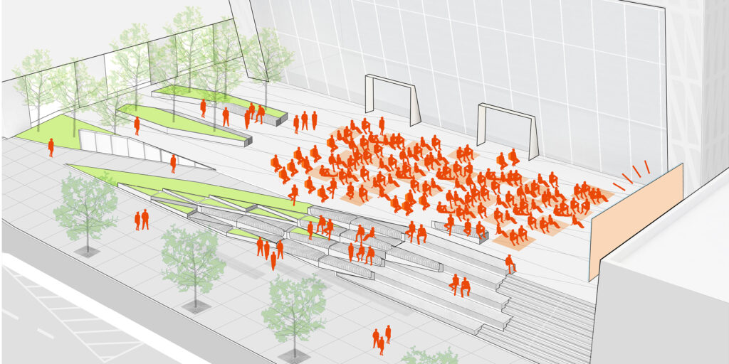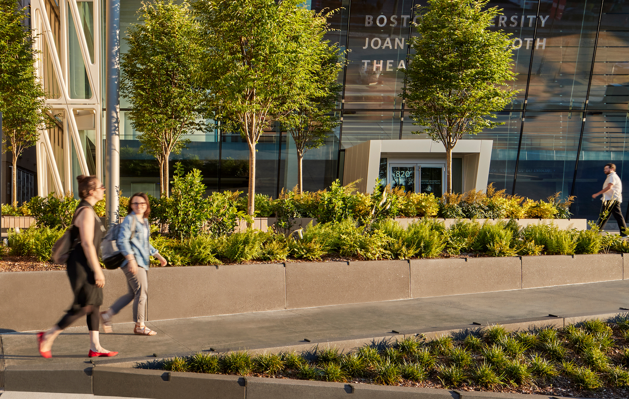 Boston University commissioned the design of the new Booth Theater and Arts Plaza to revitalize the theater arts on campus. This contemporary performance complex features both indoor and outdoor spaces, serving as a versatile platform for seasonal events. The stepped landscape thoughtfully responds to the grade change, with amphitheater seating and gathering spaces along Commonwealth Avenue. Custom planters and wooden seating enhance the streetscape and support flexible programming, and a newly integrated bike path complements the road realignment, promoting accessibility and connectivity.