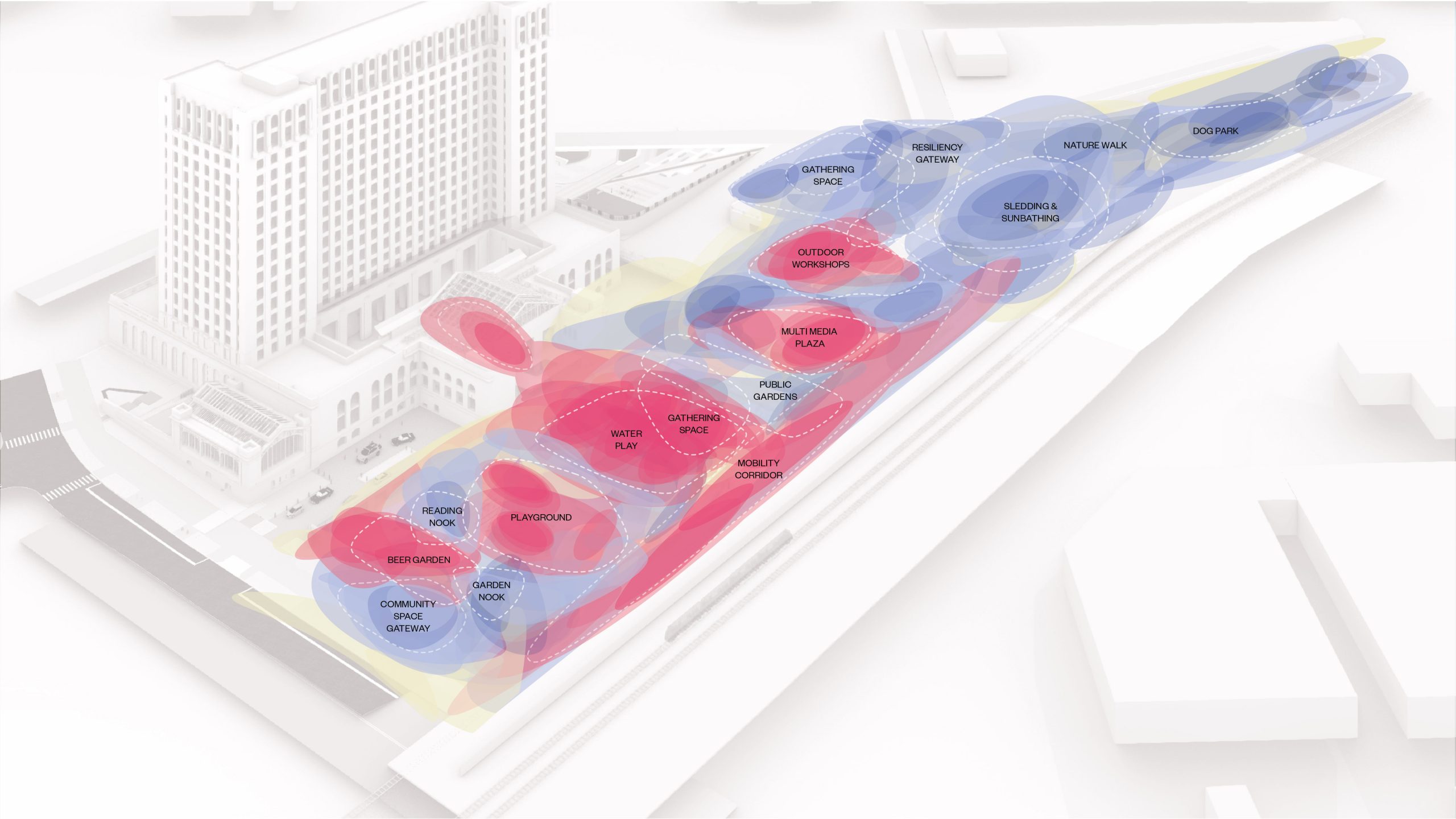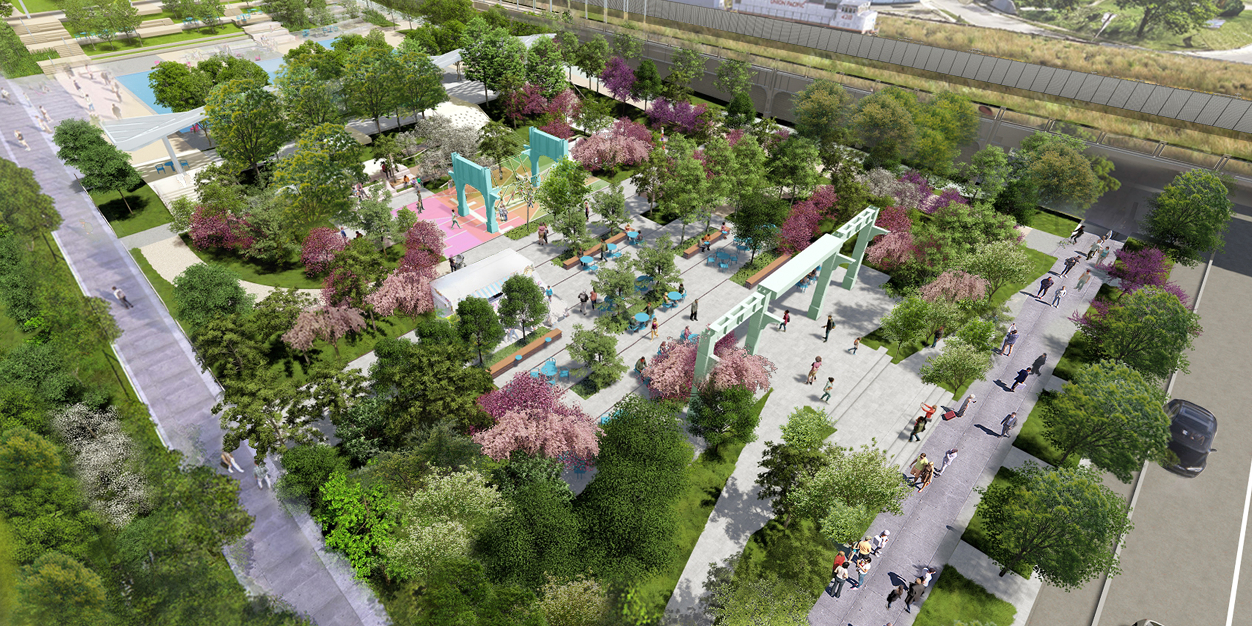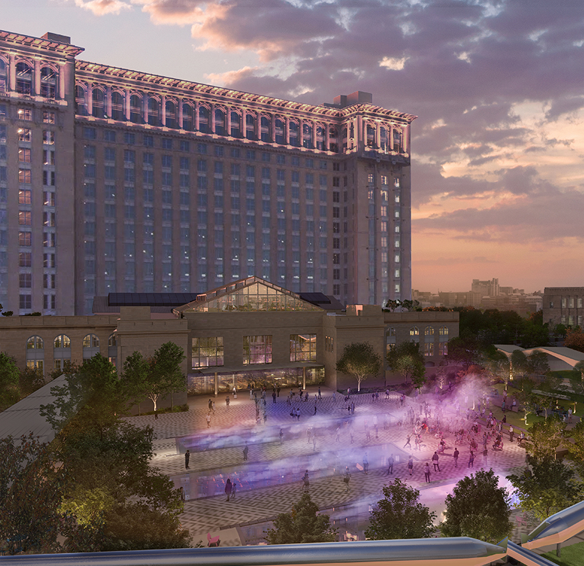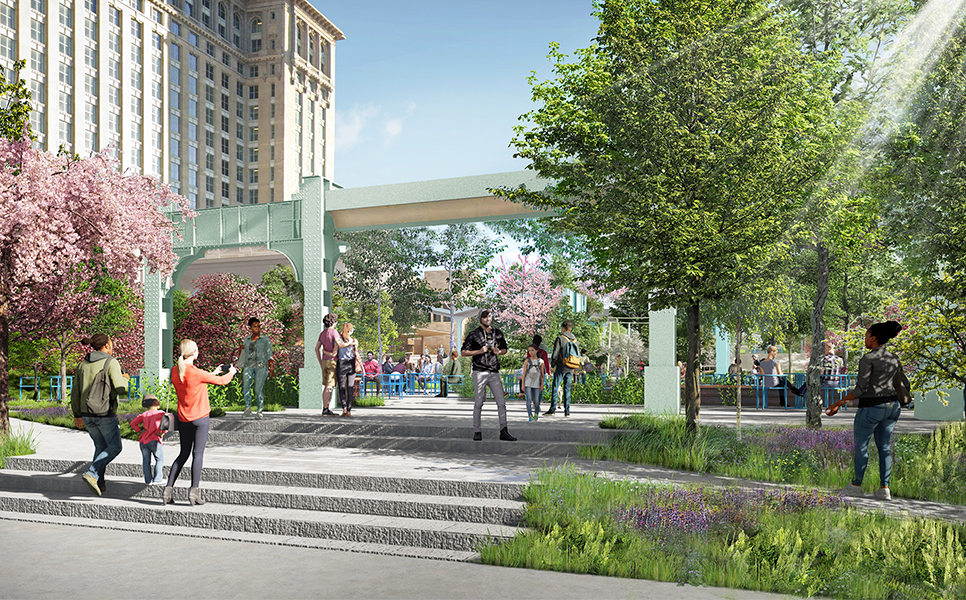 Ford’s Michigan Central Development in Detroit is a comprehensive plan that transforms this 21-acre historic train station into a resilient mobility hub. This adaptive reuse project honors Detroit’s industrial legacy, while setting the stage for the future of mobility. Once the station’s historic train shed, the Mobility Platform will offer unparalleled opportunities to observe and engage in the district’s state of the art testing and innovation. Smart sustainability measures are woven throughout the public spaces, including dynamic green storm water management systems and a collection of distributed energy generating interventions. Gateways connecting the district to the Corktown and Mexicantown neighborhoods. The park integrates over 400 new native trees to create a lush green civic space that provides refuge and inspiration for Detroit residents and visitors.