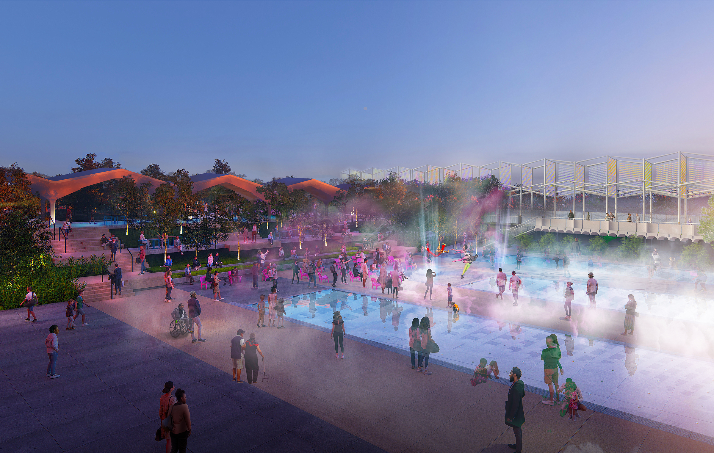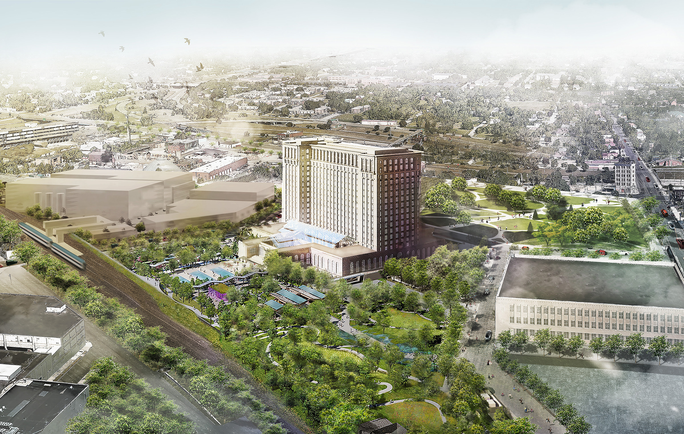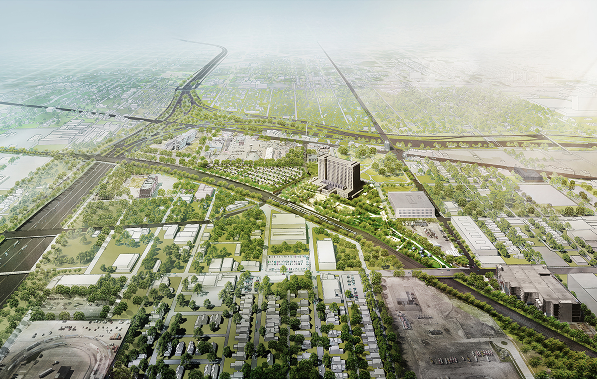 Ford’s Michigan Central Development in Detroit is a comprehensive plan that transforms this 21-acre historic train station into a resilient mobility hub. This adaptive reuse project honors Detroit’s industrial legacy, while setting the stage for the future of mobility. Once the station’s historic train shed, the Mobility Platform will offer unparalleled opportunities to observe and engage in the district’s state of the art testing and innovation. Smart sustainability measures are woven throughout the public spaces, including dynamic green storm water management systems and a collection of distributed energy generating interventions. Gateways connecting the district to the Corktown and Mexicantown neighborhoods. The park integrates over 400 new native trees to create a lush green civic space that provides refuge and inspiration for Detroit residents and visitors.