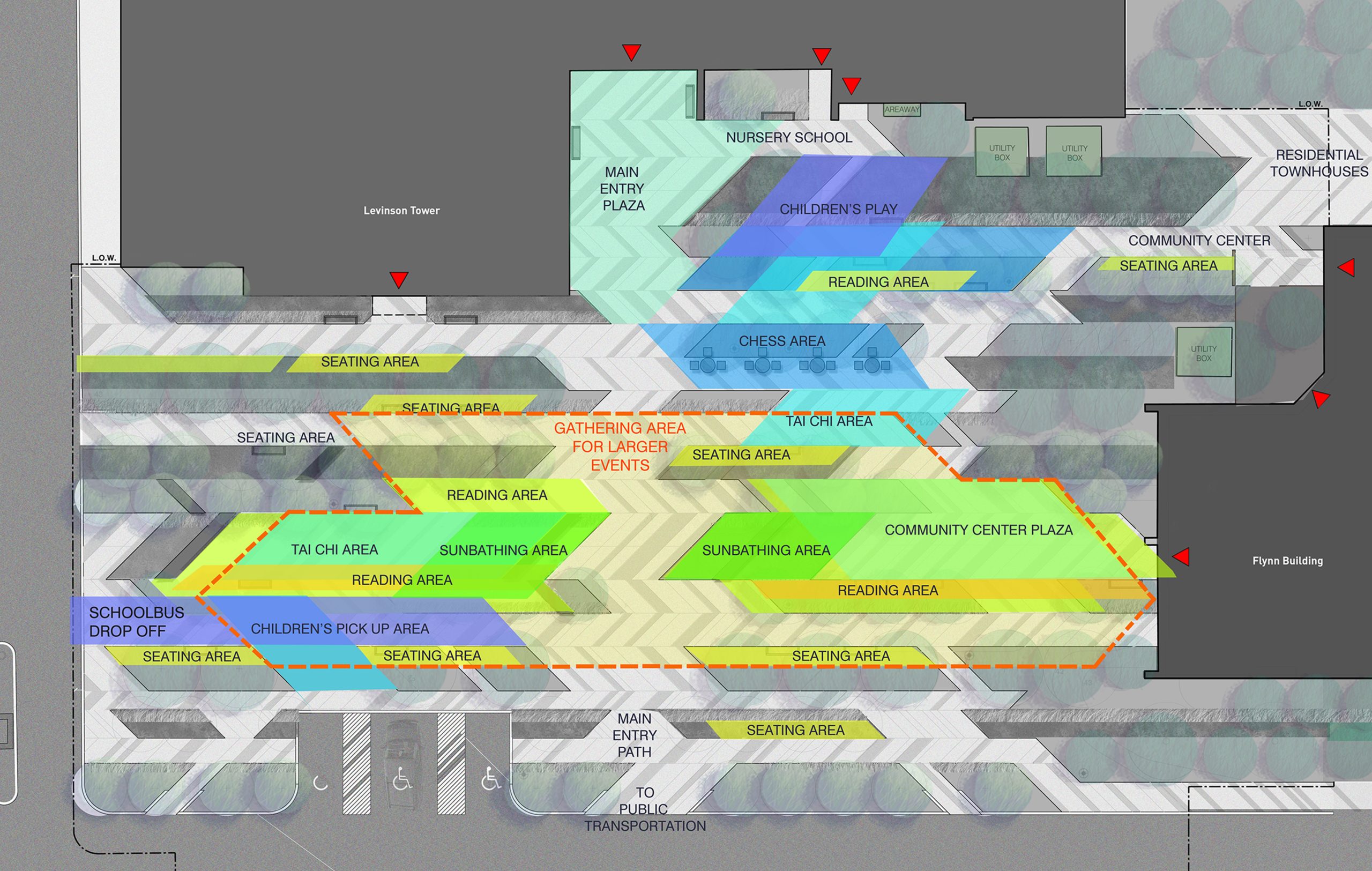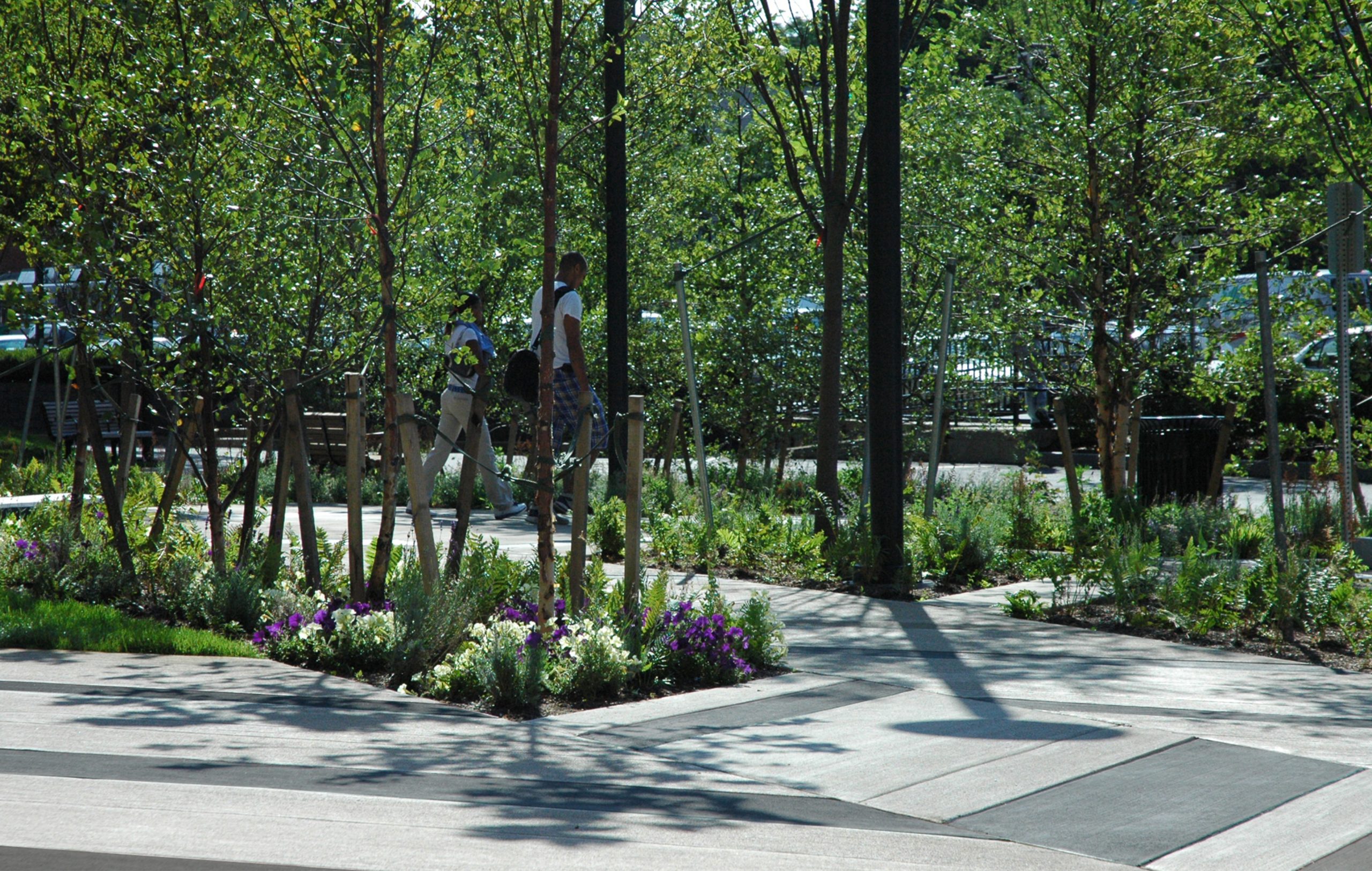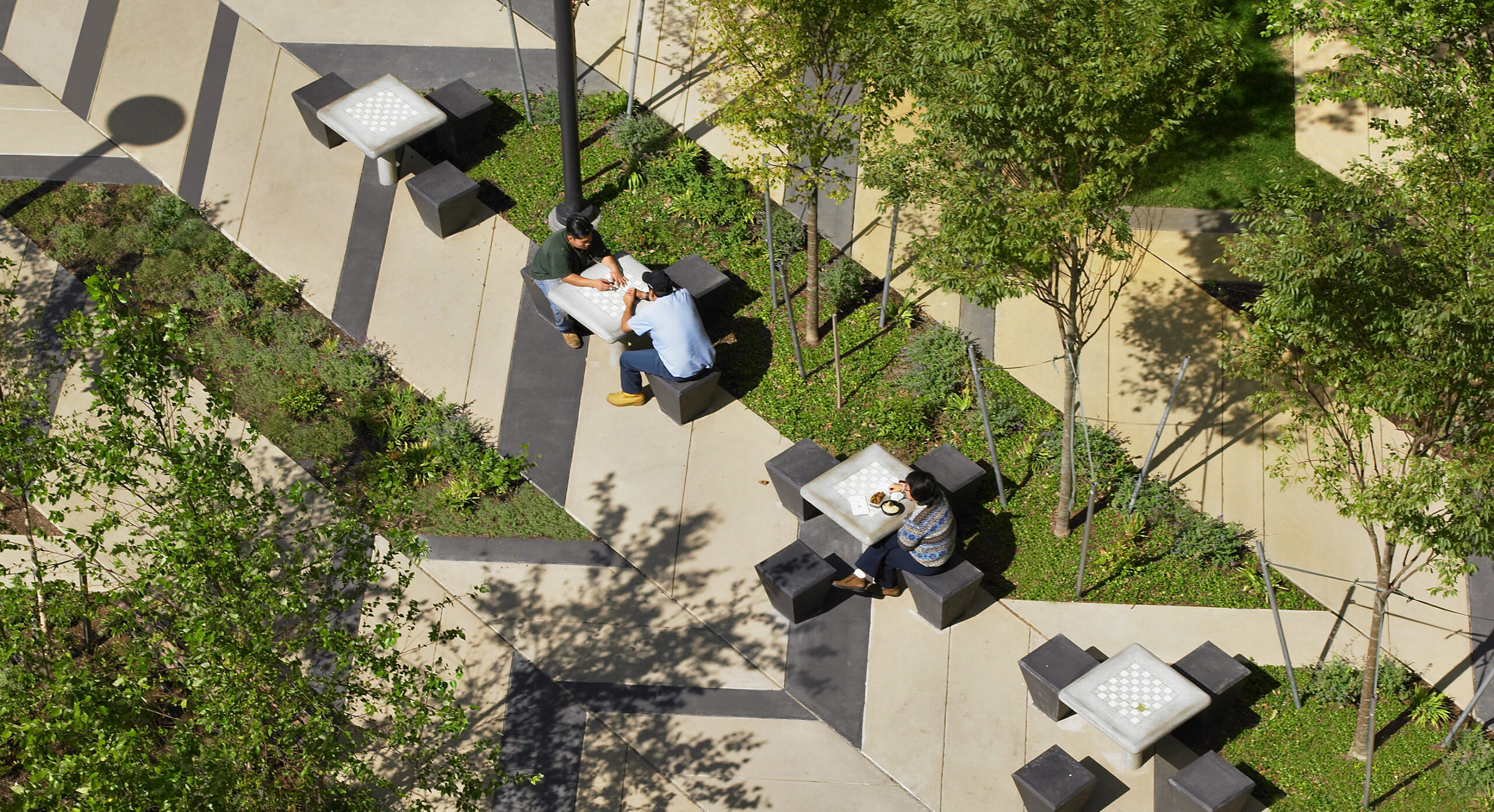 Envisioned as an urban grove, Levinson Plaza serves as a central gathering space for a diverse community within a mixed-income residential development. The design accommodates a variety of multicultural and intergenerational activities, offering areas for recreation and meaningful connections to both the community and public transportation. Paving patterns and seating link gathering and passage areas, adding a human scale to the plaza. A rich native and biodiverse plant palette creates distinct garden rooms where activities such as tai chi, children’s play, and contemplative seating can coexist harmoniously.