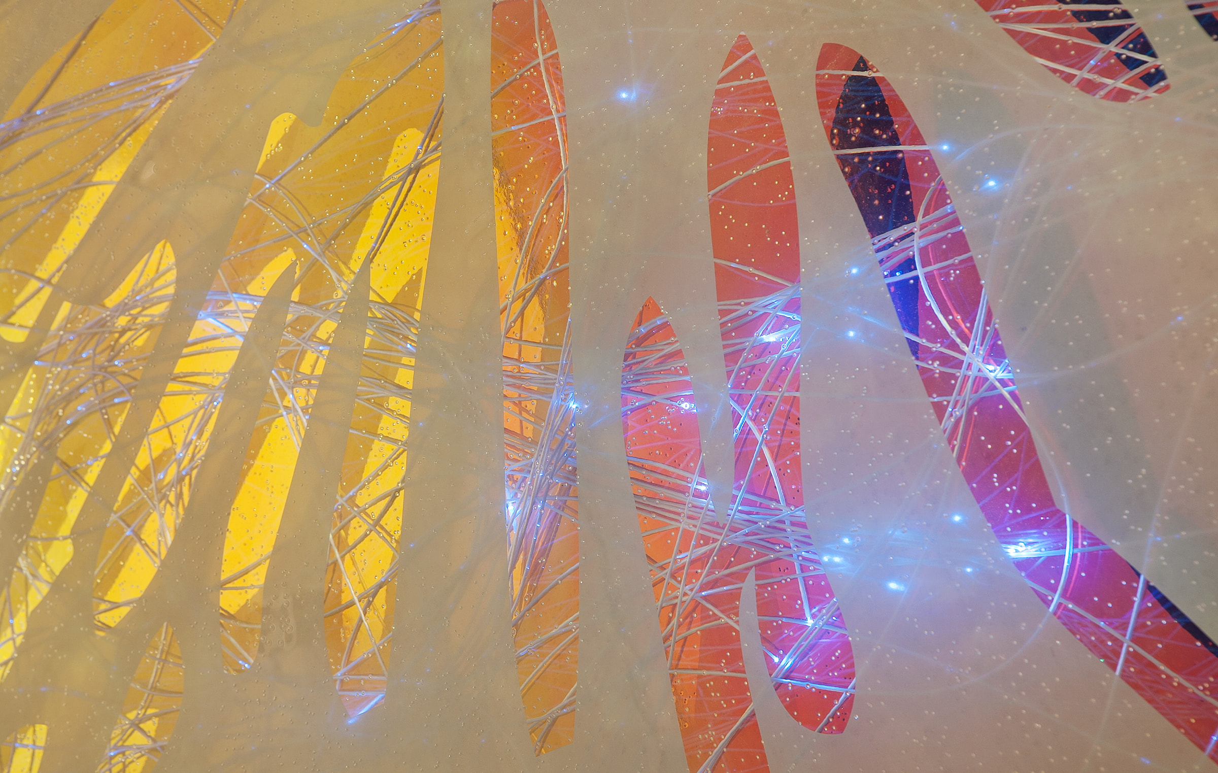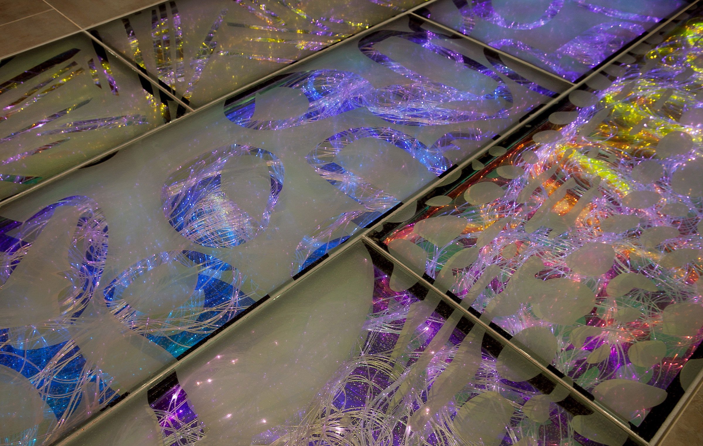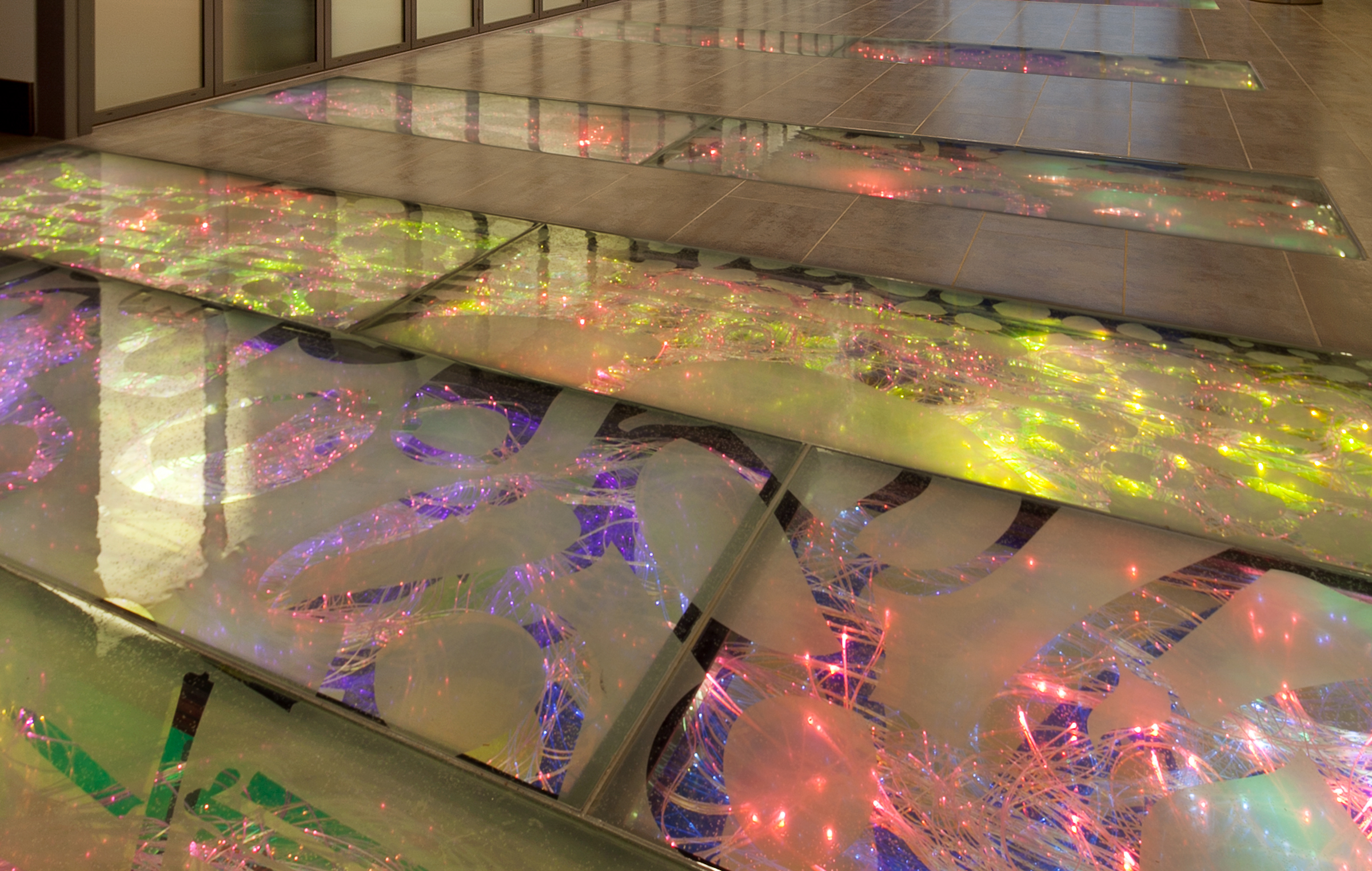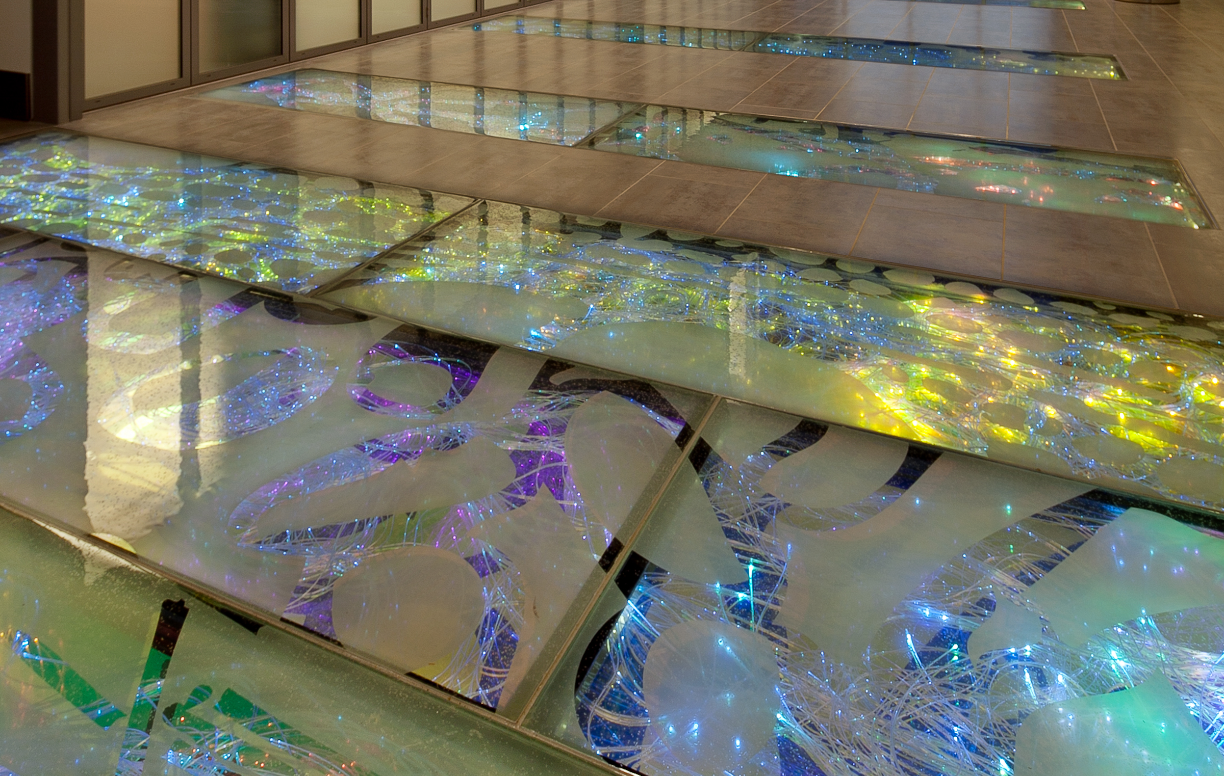 This fiber optic sculpture embeds below glass pavers at the entrance of New Jersey’s Public Health Environmental and Agricultural Laboratory. The artwork incorporates layers of custom fritted glass, fiber optic cables, and dichroic colored glass, creating a dynamic piece that transforms as viewers walk across it. Cellular images contributed by laboratory scientists depict healthy microscopic plant and animal life on the glass surface. As the viewer moves, these images evolve, with hundreds of points of color beneath the glass symbolizing the virus research being done by this institution; a visual representation of transformation and scientific discovery.