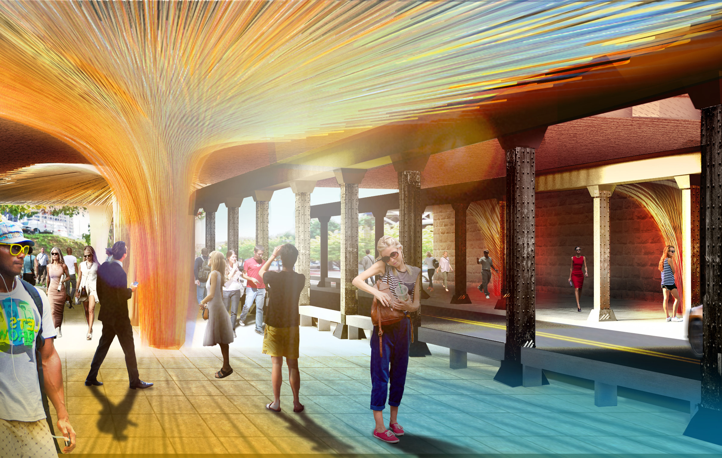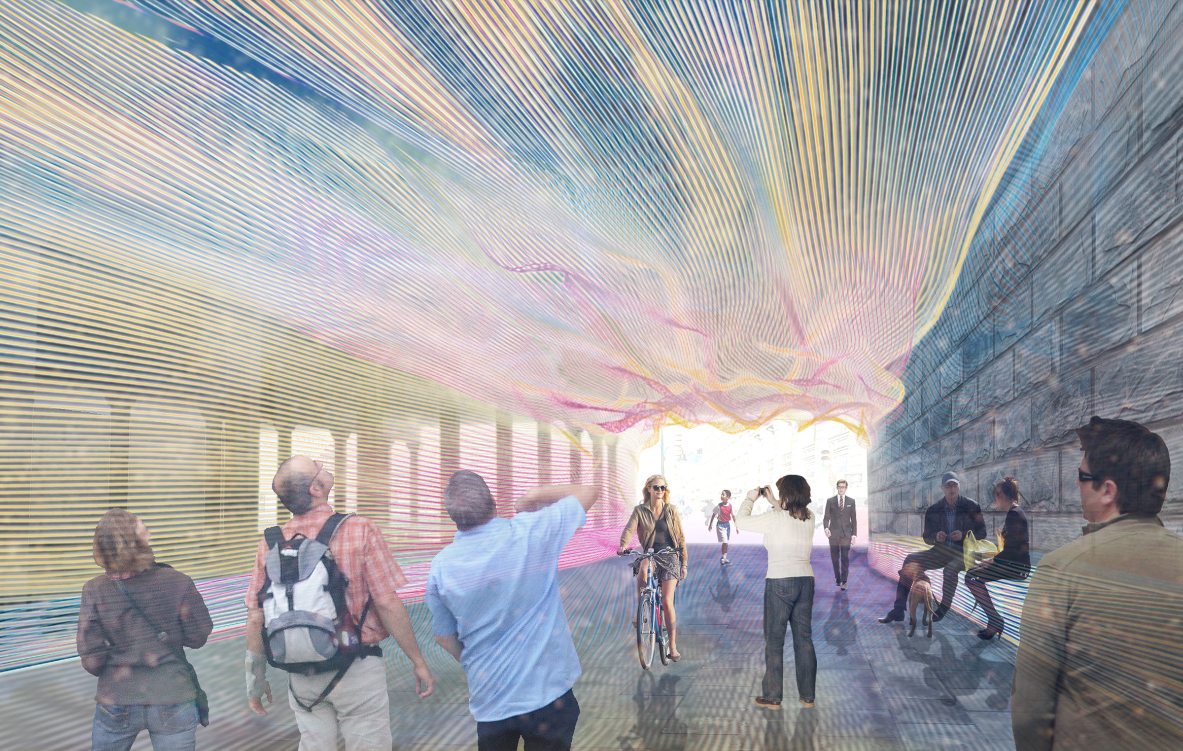 As the winning entry for the NoMa Underpass, this proposal transforms four underpasses into light-filled, dynamic spaces that enhance the experience for pedestrians, cyclists, and multi-modal traffic. Our design for the M Street underpass features a woven metal fabric canopy, creating a monochromatic color field that moves from East to West with cool blue tones, inspired by the concept of movement and transformation. The L Street underpass is reimagined with an organic canopy structure, where springs on the canopy edges resonate with vibrations from passing trains above, creating an urban forest effect that dapples light on the ground below. This fluid light field becomes a dynamic destination, offering a vibrant, immersive light experience at night.
