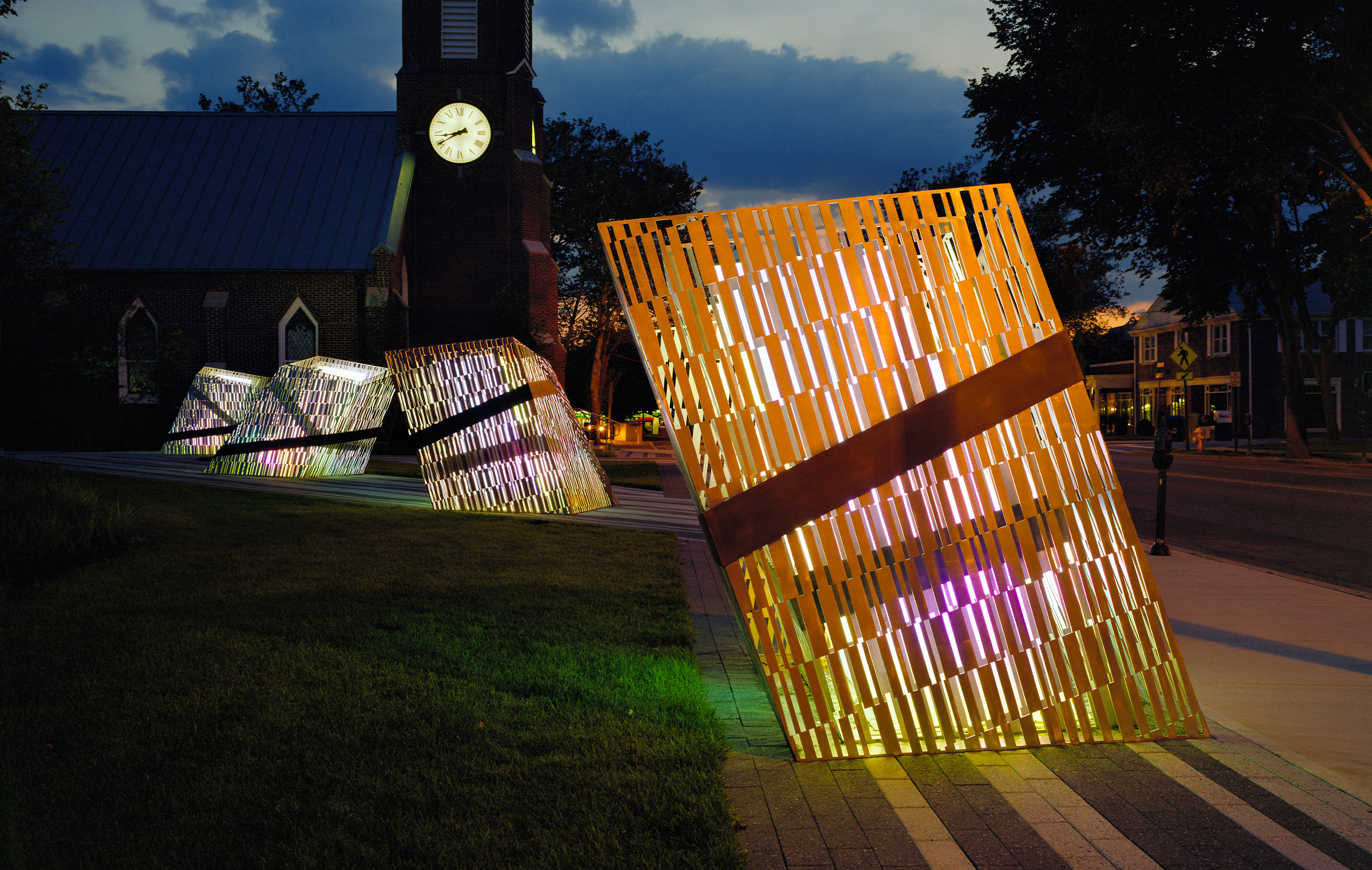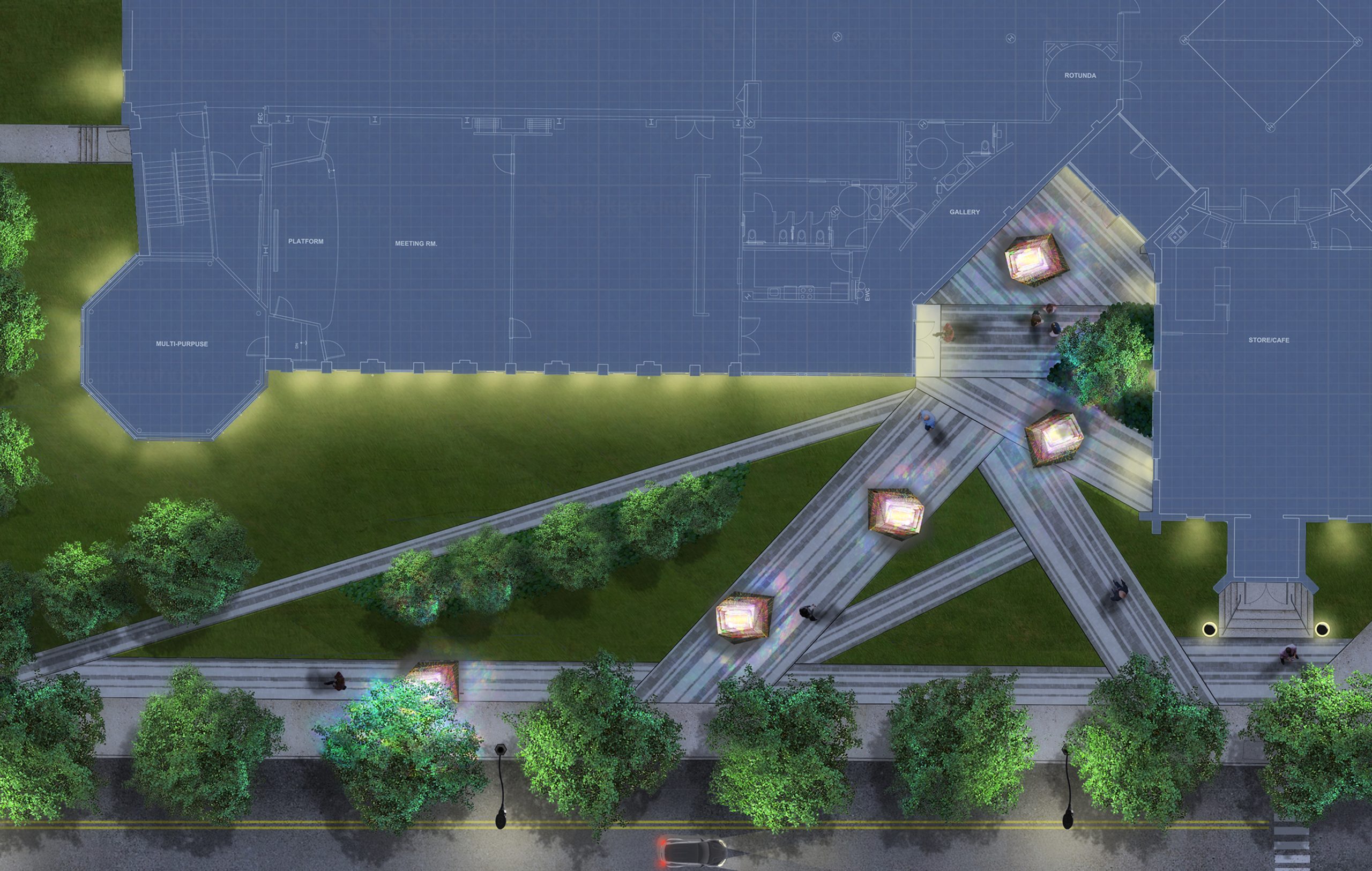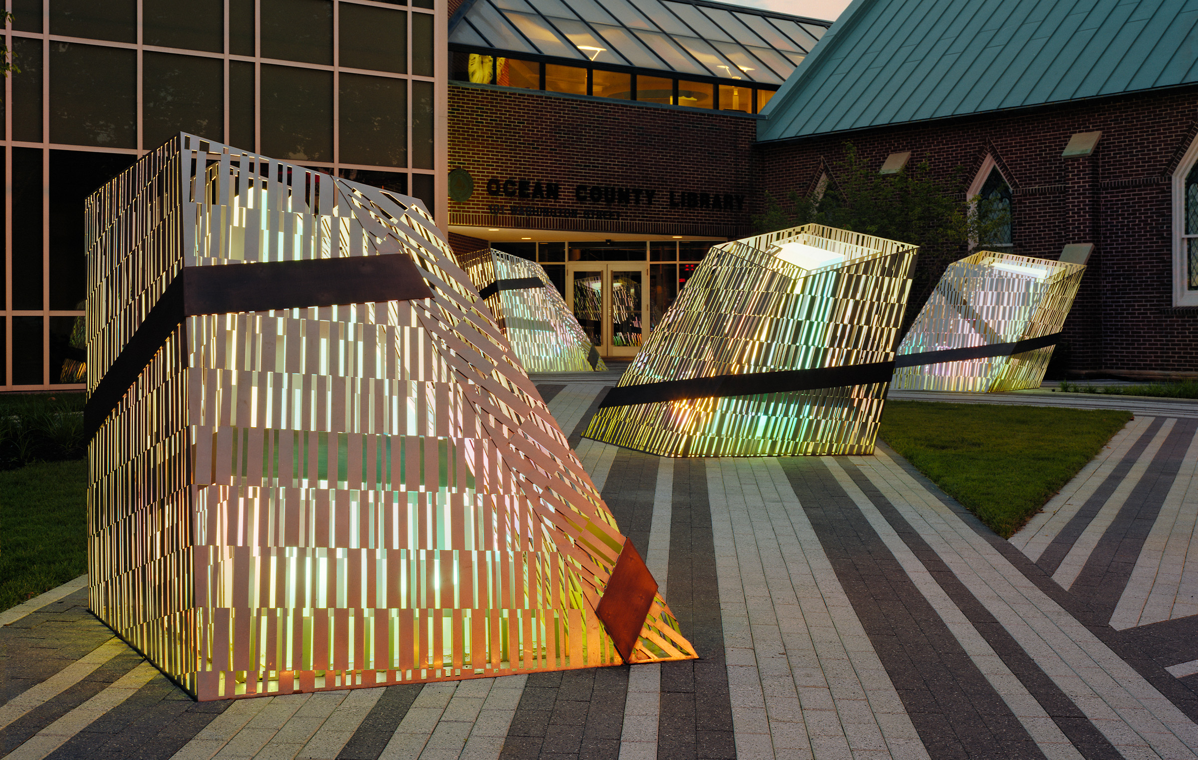 Barcode Luminescence is a sculptural landscape installation that transforms the entrance of the Ocean County Public Library into a dynamic civic landmark. Conceived as both a public gathering space and a visual beacon, the design highlights the library’s role as a center of knowledge, connection, and community. Anchored in a new courtyard with a strong connection to the street, a series of laser-cut steel lanterns stand like illuminated sentinels, guiding visitors toward the building’s entrance. Their patterned surfaces evoke the texture of barcodes (symbols of information-sharing and access) casting intricate shadows that shift with the light. This work celebrates the library’s expansion while underscoring its community mission to enlighten and welcome.