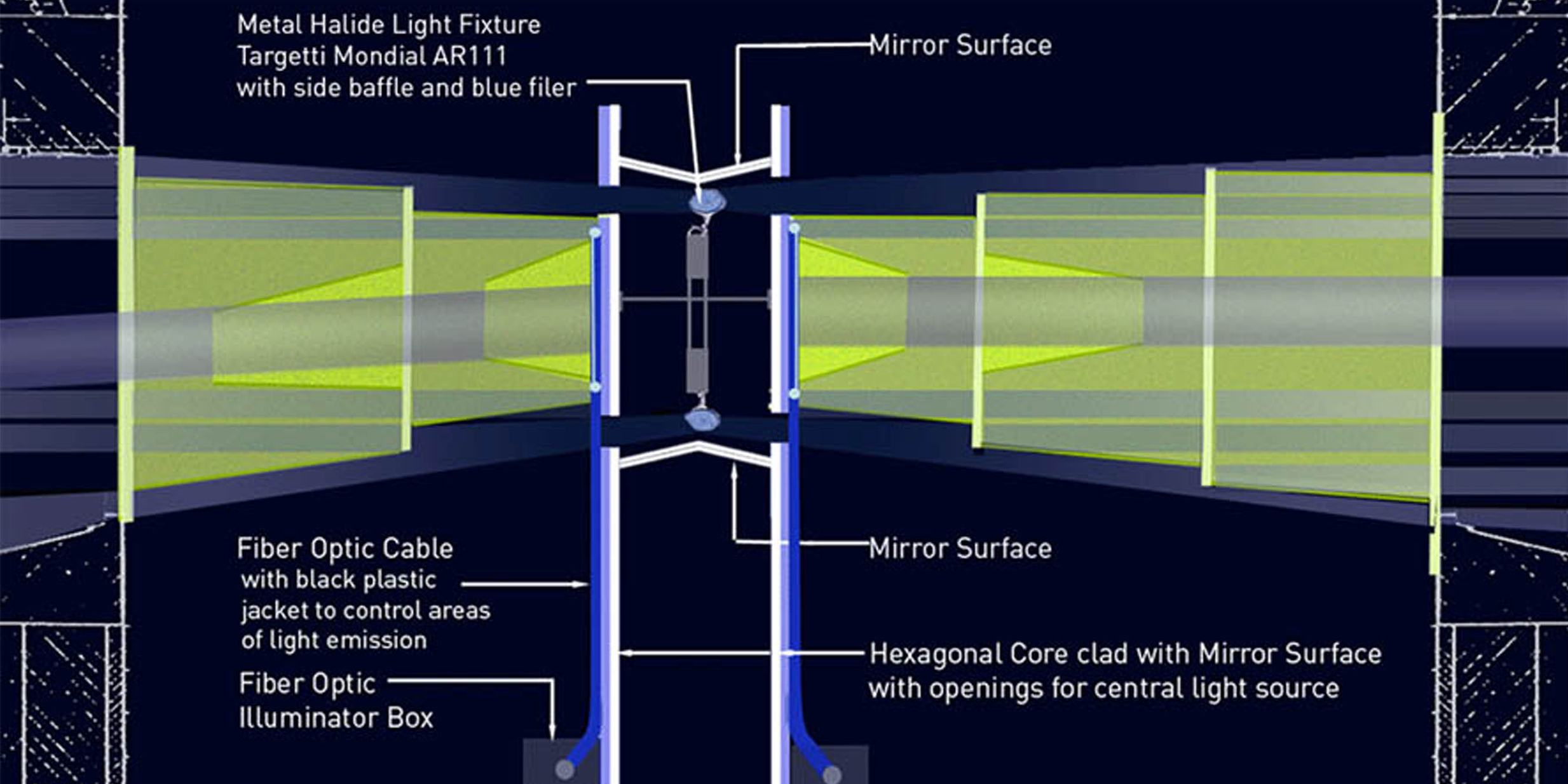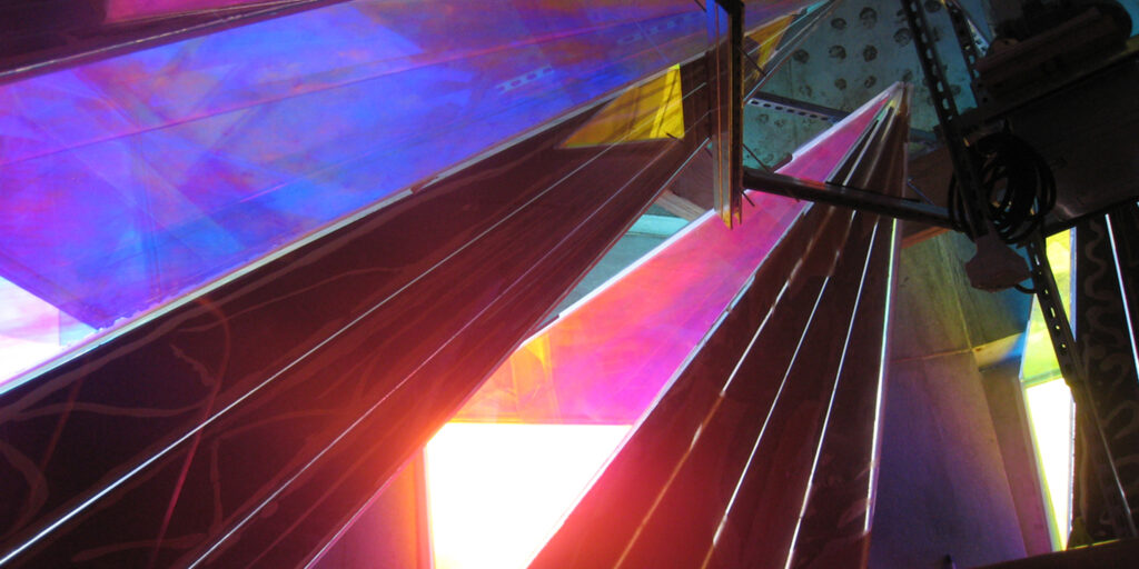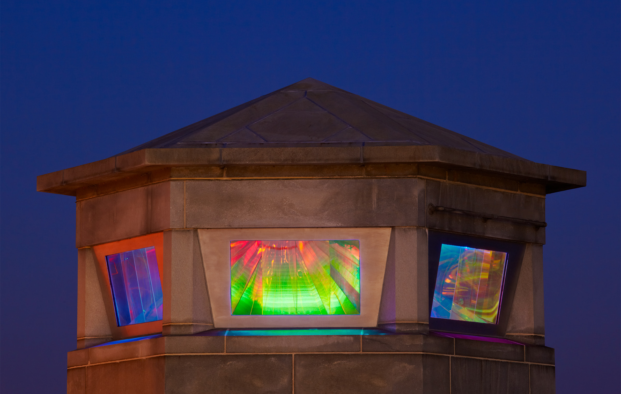 Comprised of six dichroic and reflective resin surfaces, one for each facet of the tower, the installation creates a kaleidoscope effect of refracted light that shifts and evolves throughout the day. A central lighthouse light rotates on a carefully choreographed schedule, transforming over a 60-minute cycle, and operates 24 hours a day.