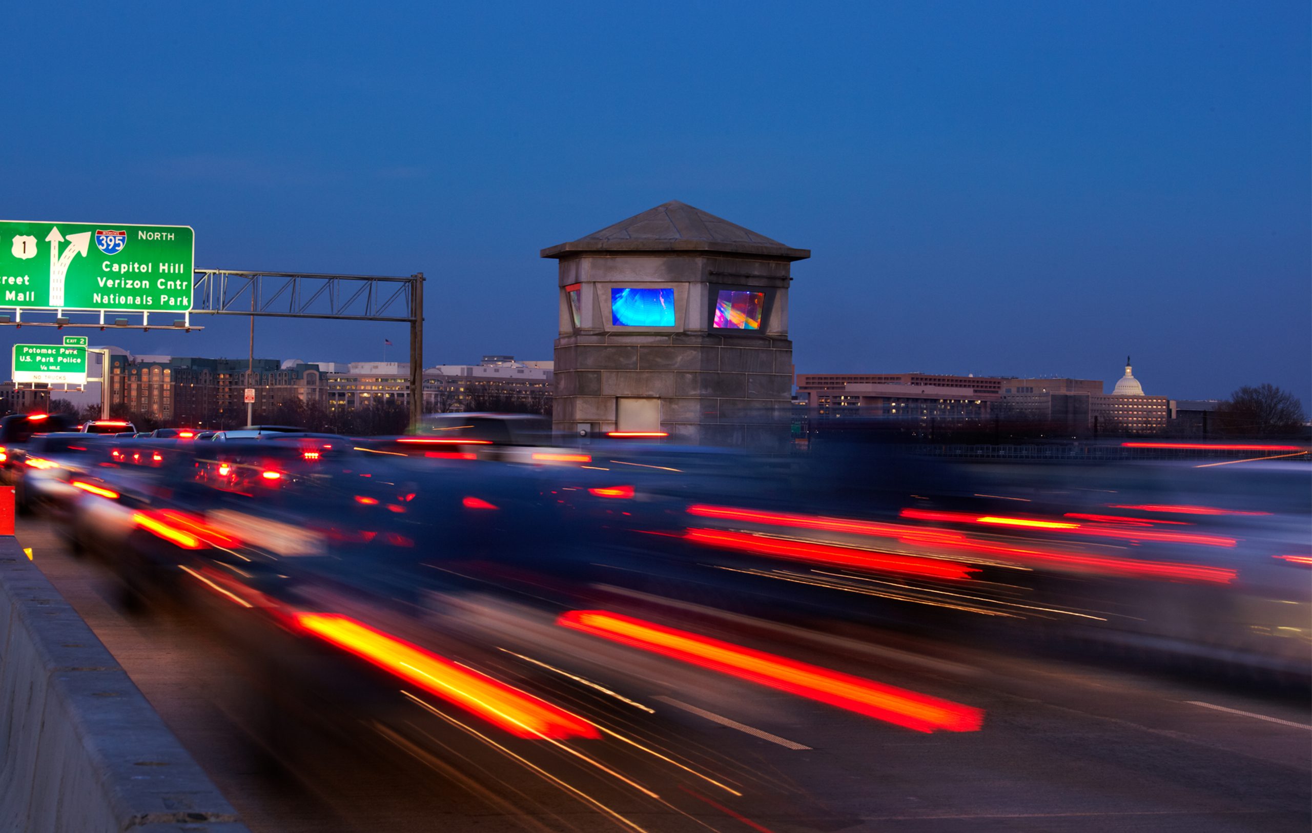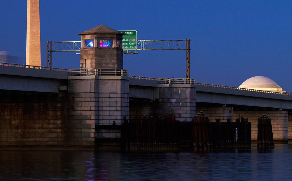 From afar, the installation serves as both a beacon and a visual landmark, reflecting the surrounding activity of the river and traffic back to drivers crossing the bridge at 40 miles per hour. In doing so, it redefines the tower's role, enhancing its aesthetic value while offering a captivating, constantly changing light show that welcomes visitors and commuters to Washington, D.C.
