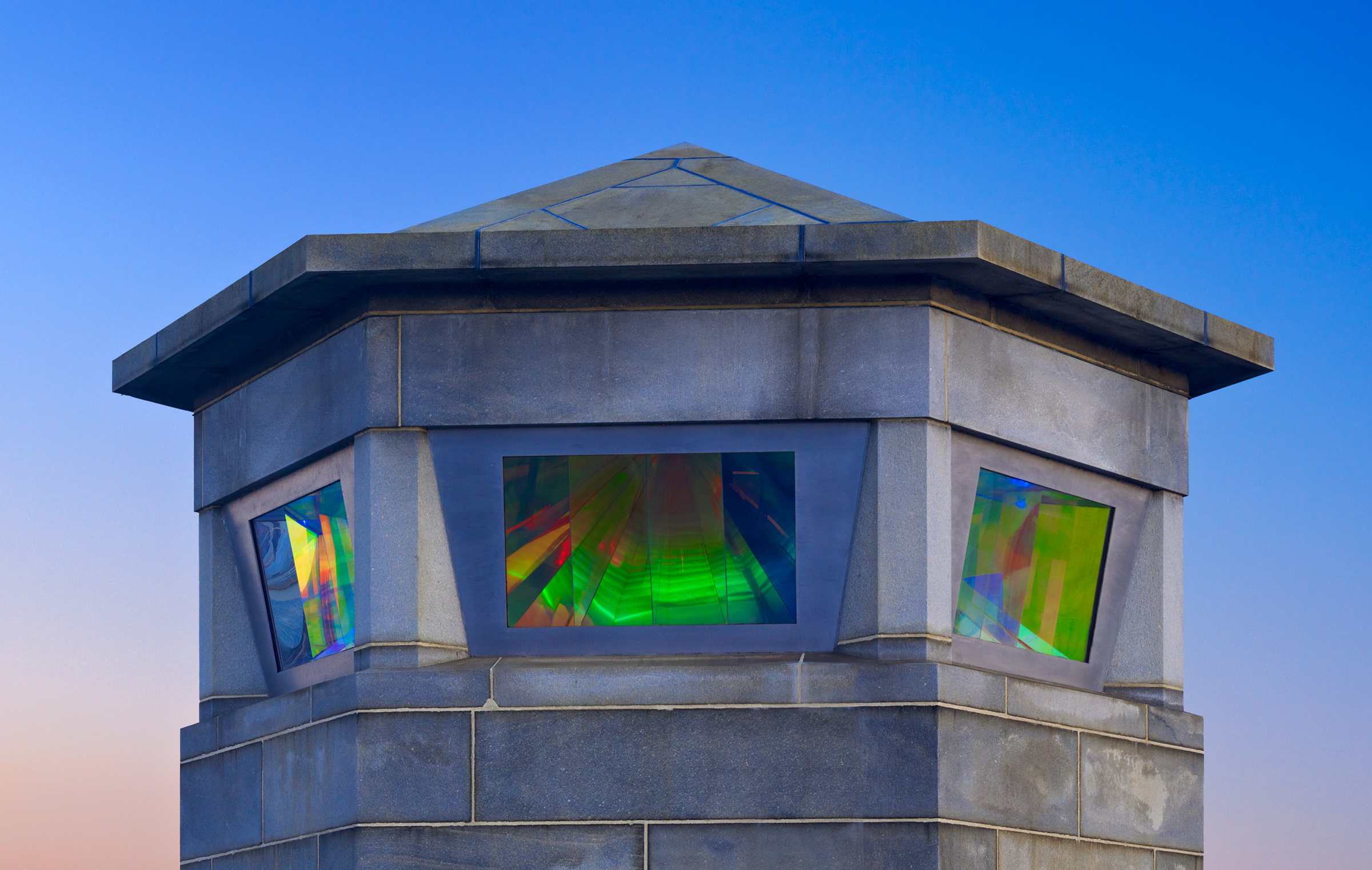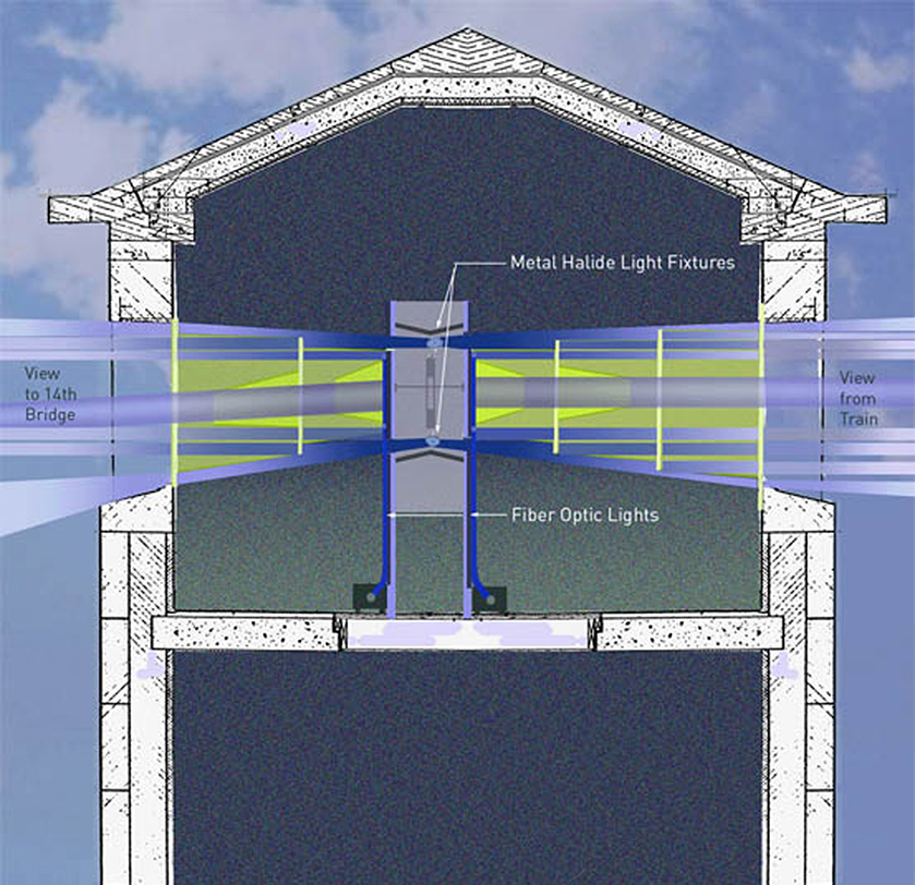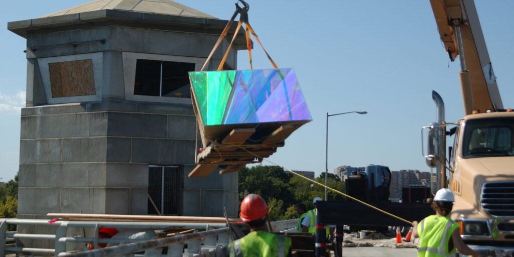 The granite tower on the 14th Street Bridge, abandoned since the 1960s after the highway bridge was reconstructed, was long considered an eyesore. Today, a central lighthouse light rotates on a choreographed schedule based on 60 minutes of transformation for 24 hours. A series of six dichroic and mirrored surfaces, one for each facet of the tower, creates a kaleidoscope of light.
