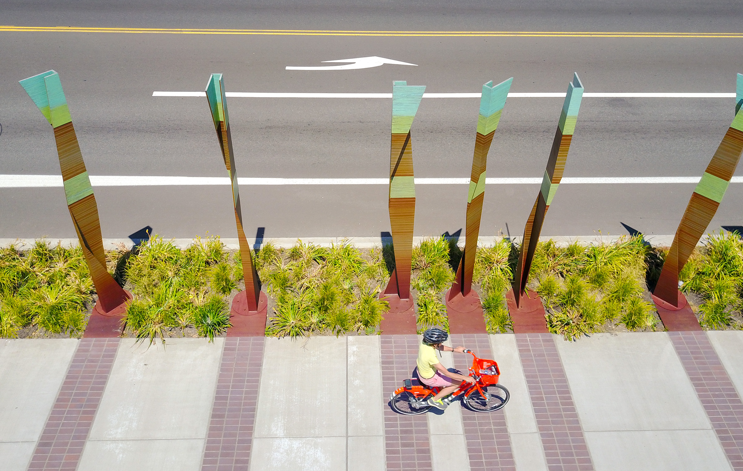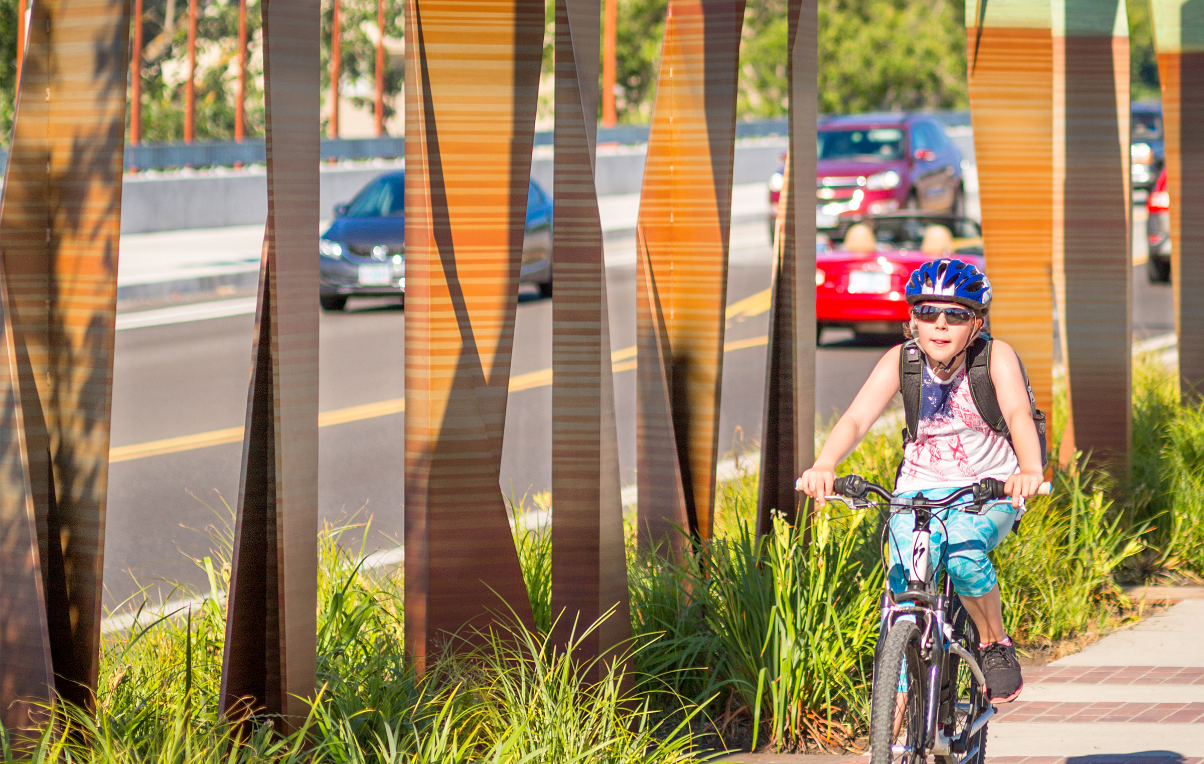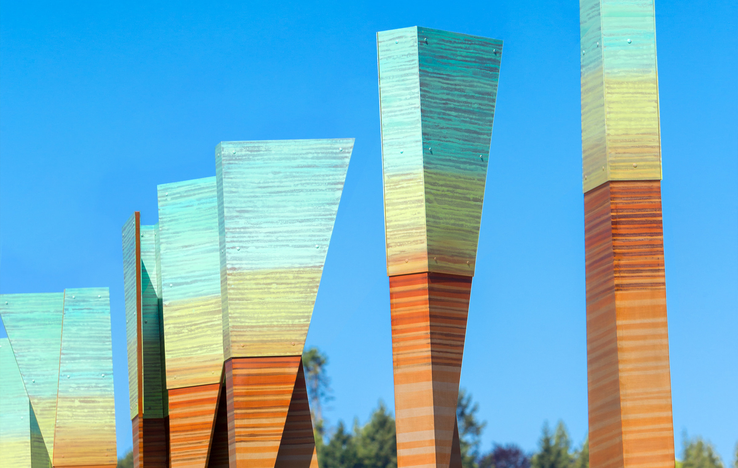 Inspired by the power and beauty of the geologic and natural phenomena of the Willamette River Valley, the stratum project is a series of geologic totems along the new bridge. The sculptural elements define the bioswales along the street edge, acting as a gateway environment defined by the speed of the users as they pass through this important threshold. Layers of various recycled and formed materials create a stitched surface that represents earth, water, and sky as the gateway to the Sellwood community in Portland.