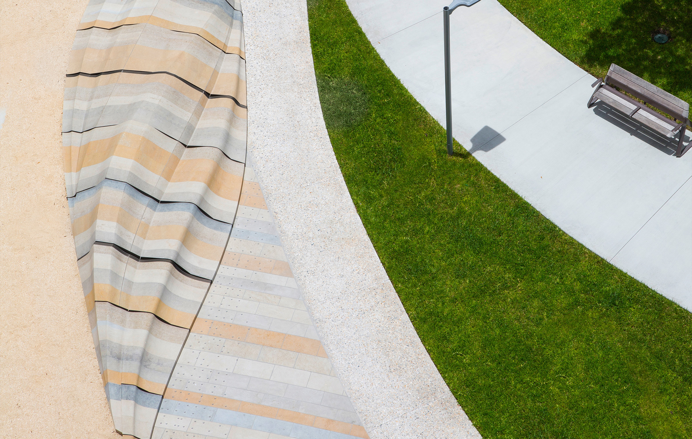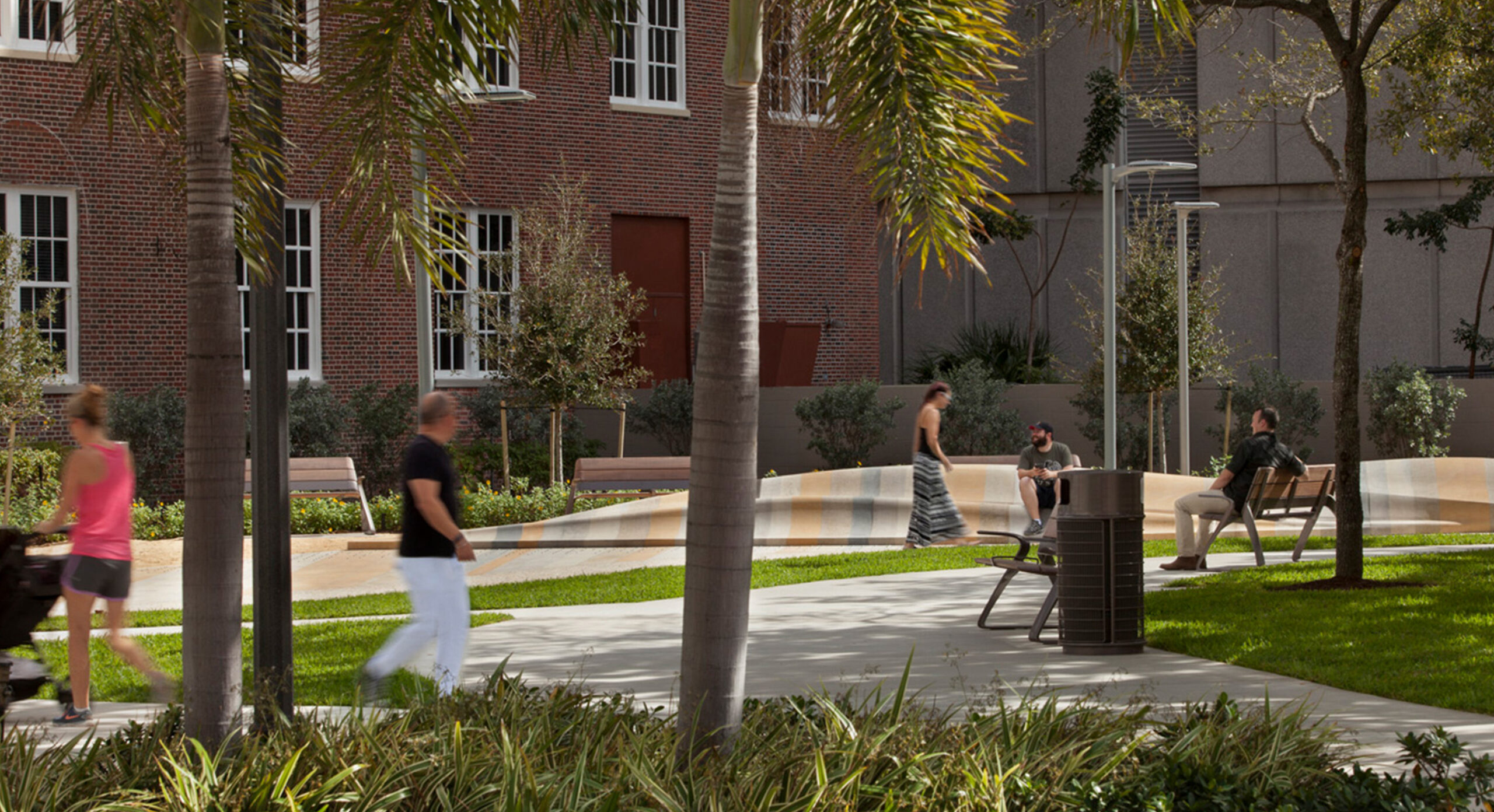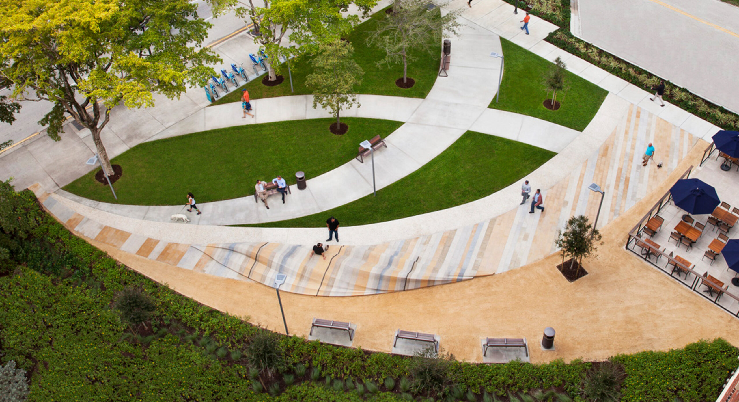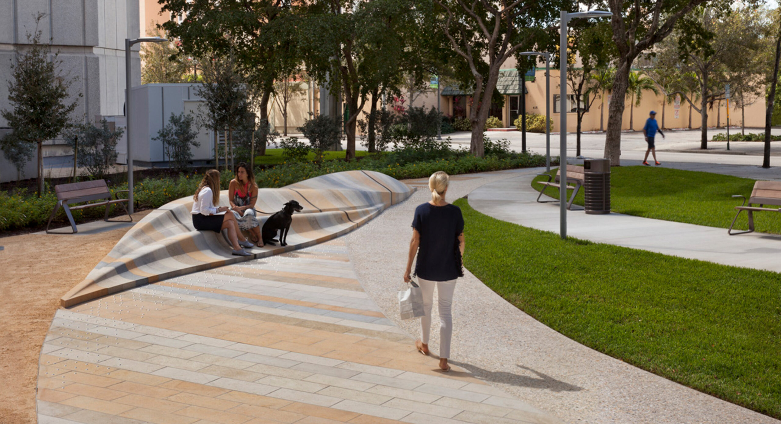 The Alexander Park is a neighborhood destination designed for informal gatherings and passive activities, conveniently located near an active West Palm Beach retail center. This inviting plaza fronts a mixed-use development and features a laminated sculptural stone element that offer seating in the center of the Park. Serving as both a public amenity and a sustainable and resilient strategy, the stormwater management is inspired by the geologic patterns of the region, providing a contemplative oasis for visitors.