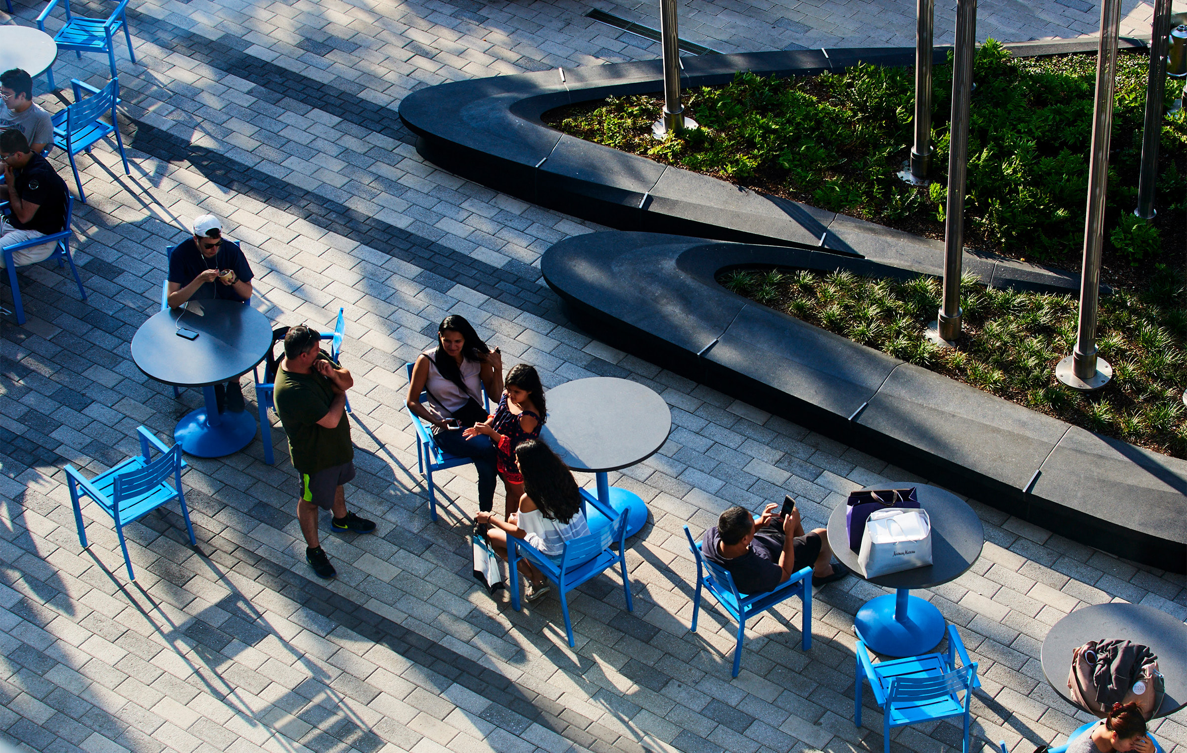 The plaza, with its organic benches and gardens, brings a unique experience inviting visitors to engage the vibrant programming that defines this mixed-use hub.