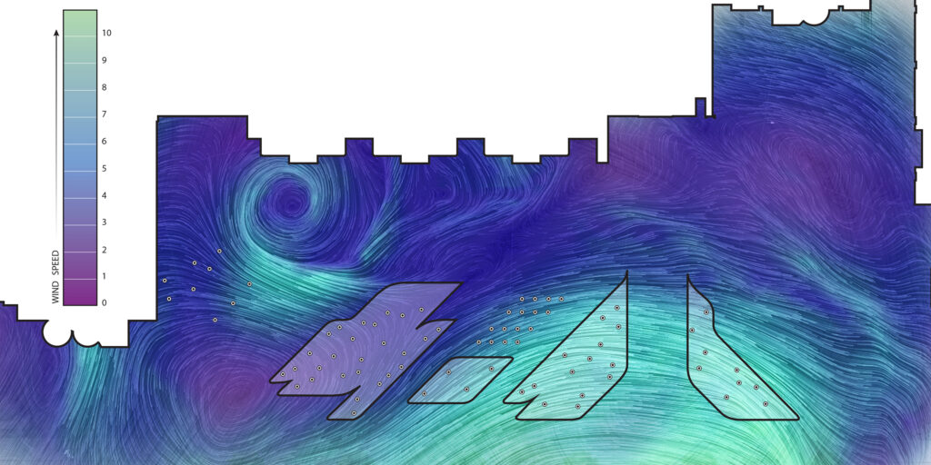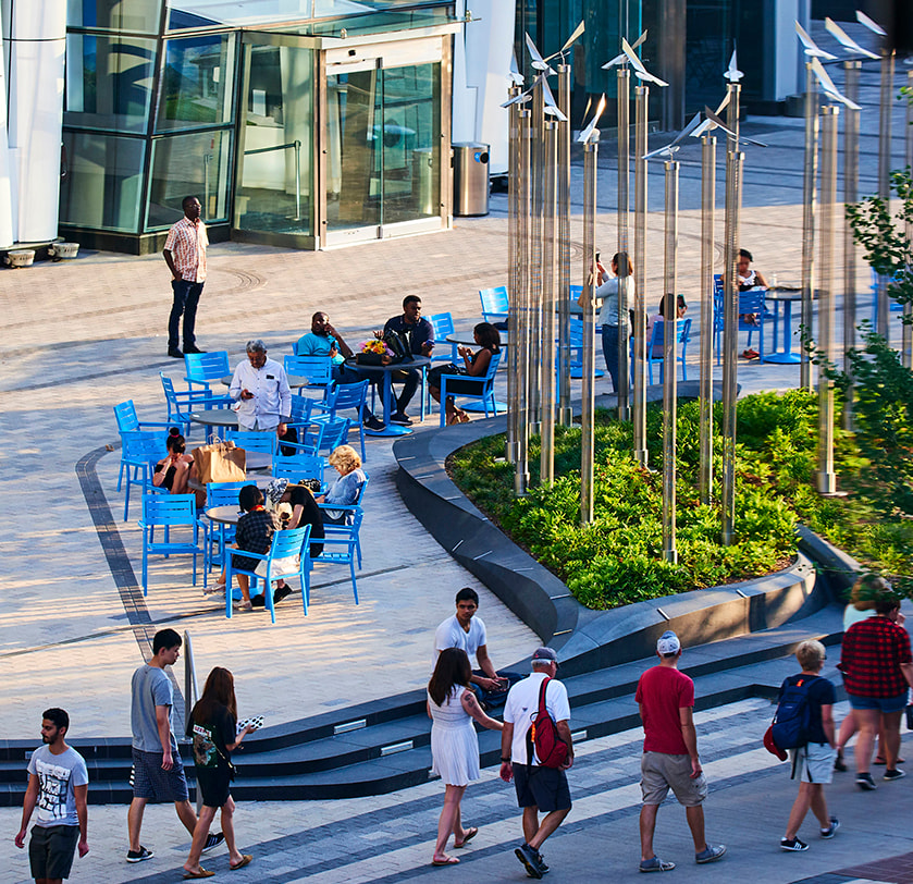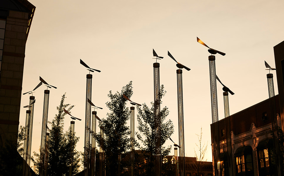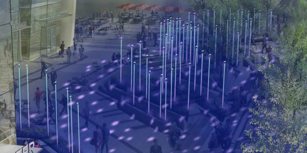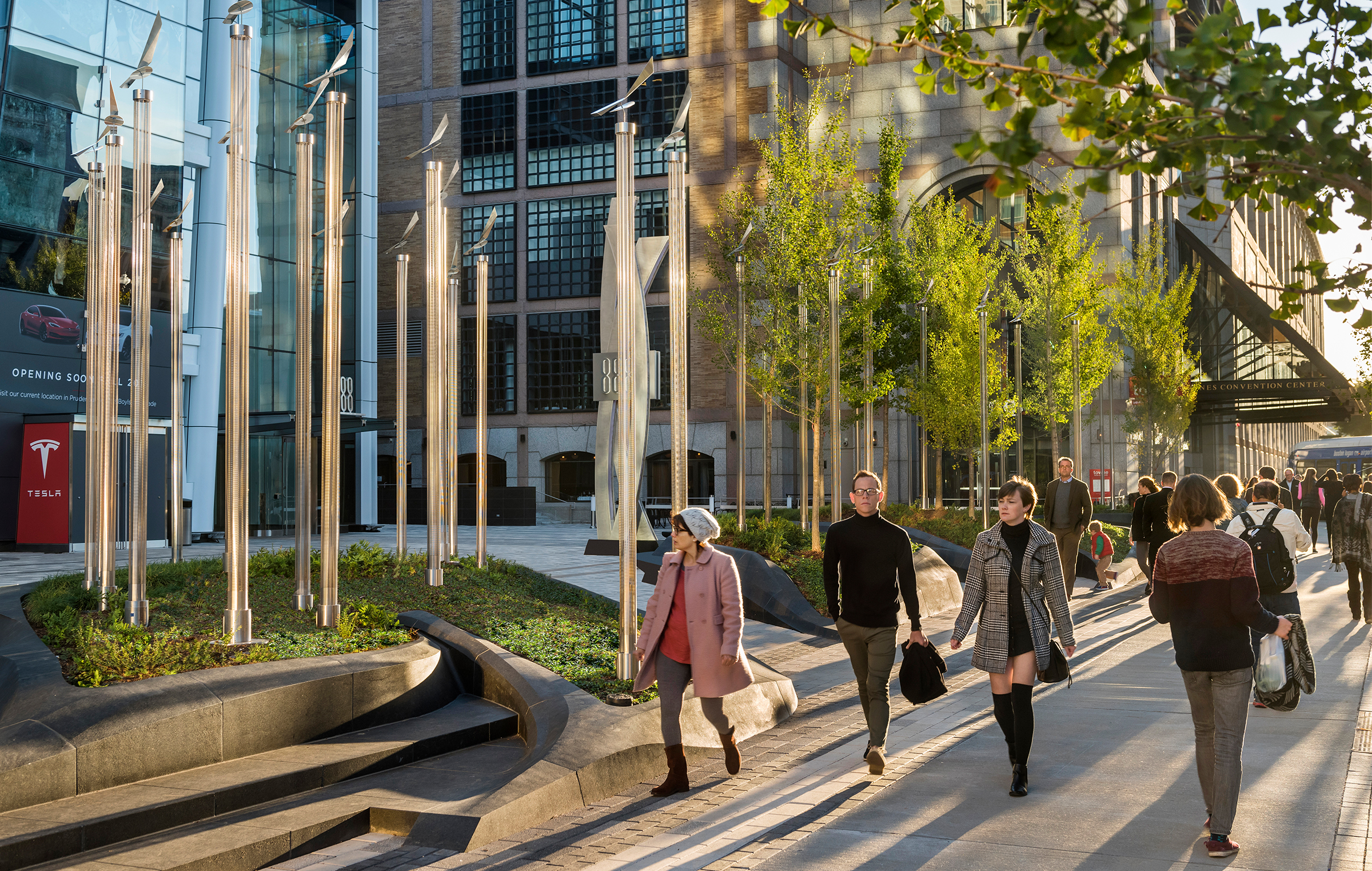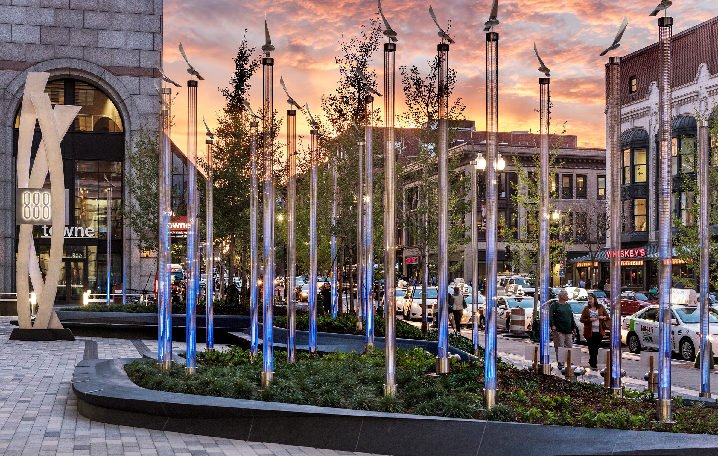 The design transformed this underused windswept plaza into a vibrant urban destination with custom planters and lighted wind vanes that celebrate the movement of wind through the project.