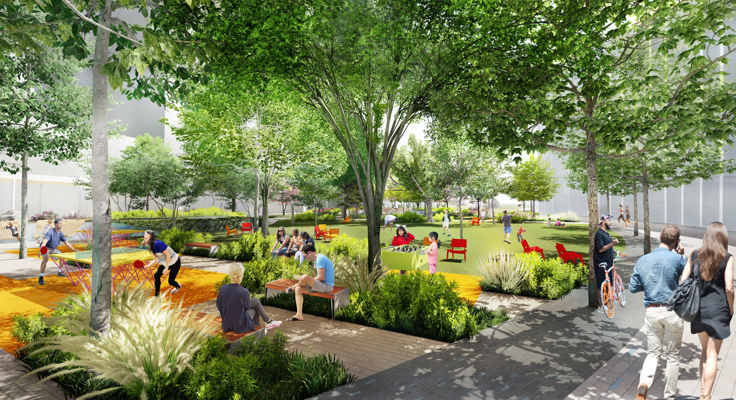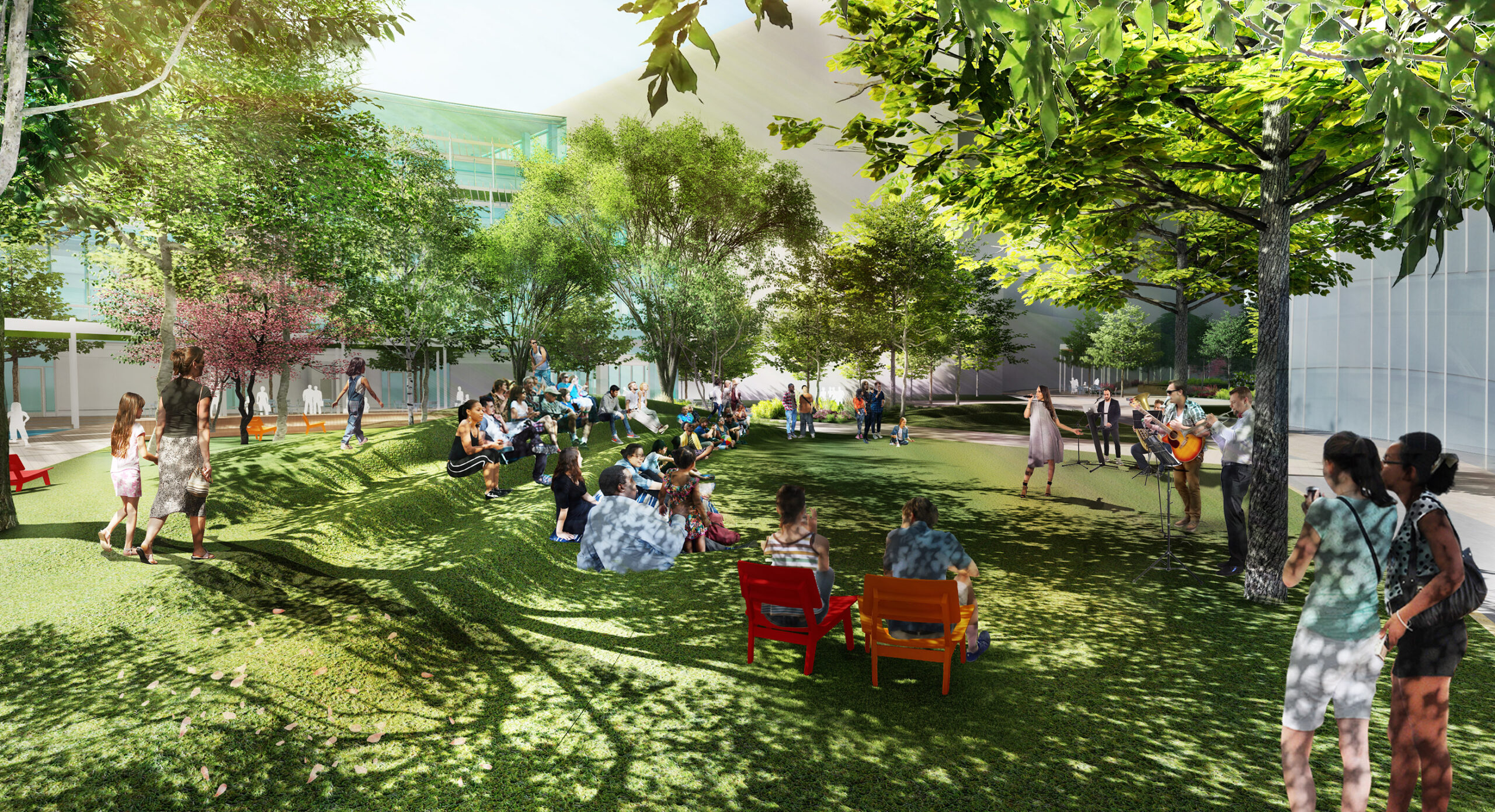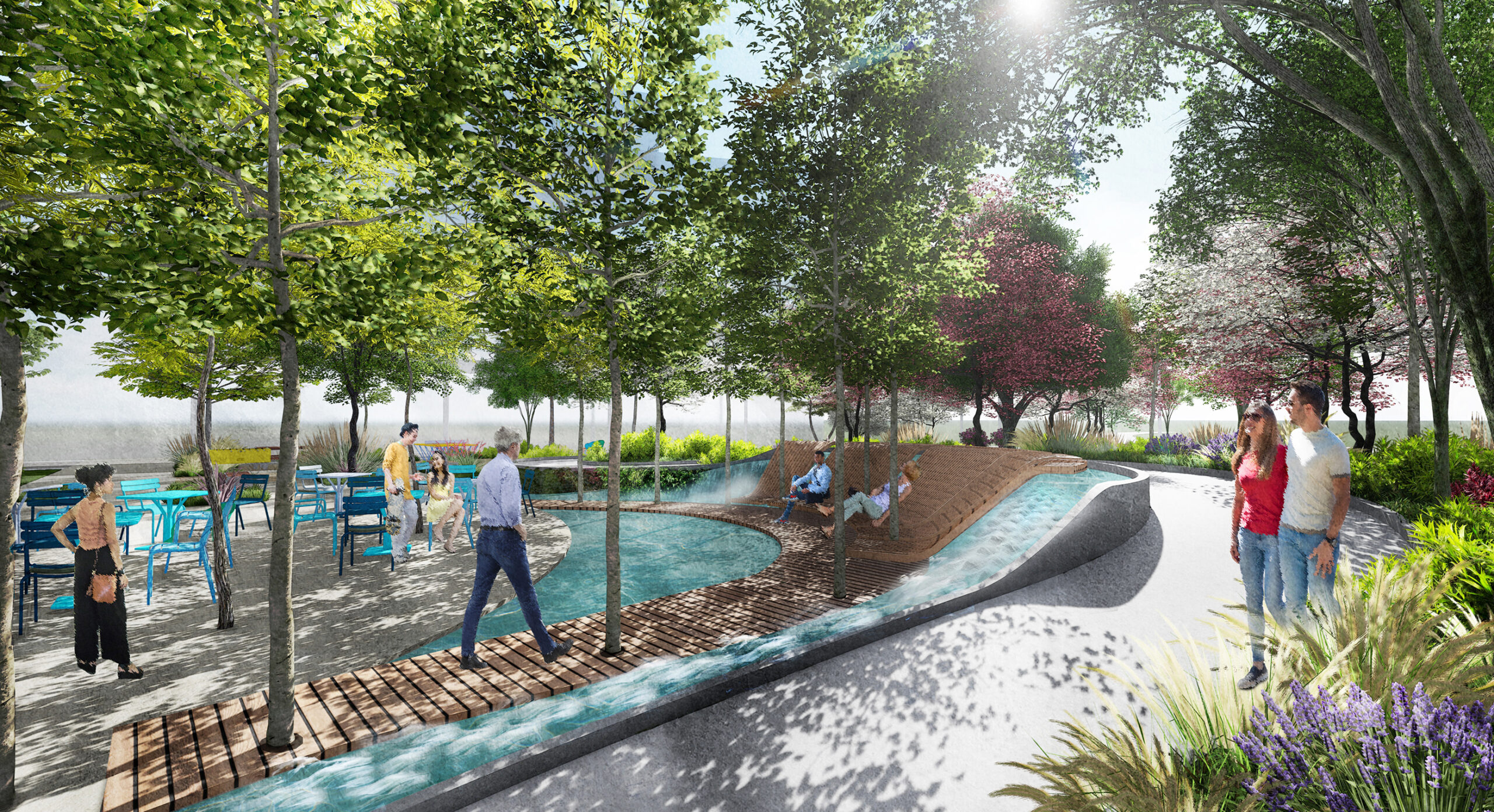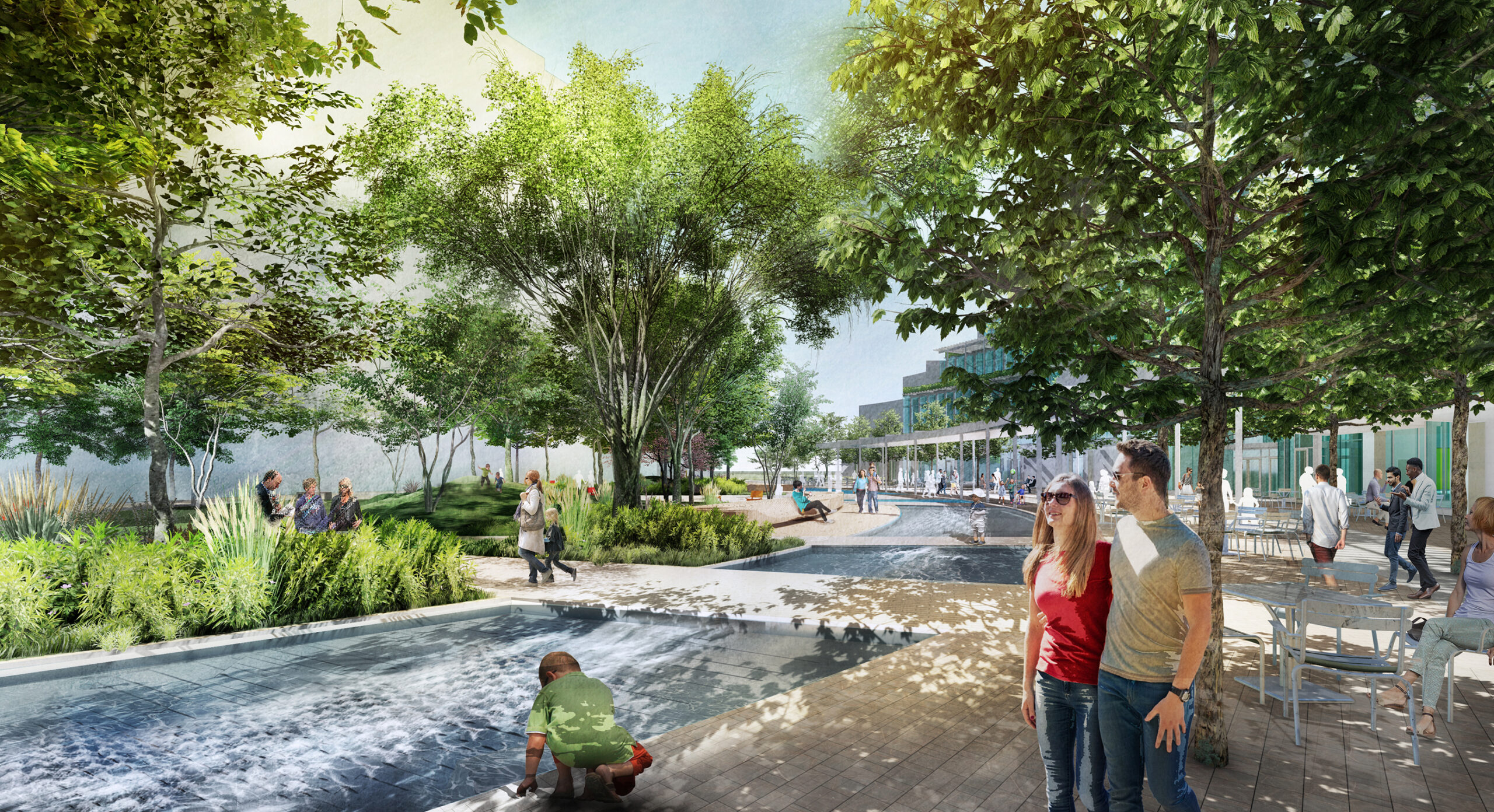Previously home to surface parking lots, the site lies within a 500-year floodplain. The planned area raises the ground plane of the site by as much as 8 feet. Supported by a a multifaceted stormwater strategy that includes subterranean cisterns, a soil profile that holds stormwater like a sponge, and over 400 new trees that absorb approximately 2.3 million gallons of rainwater, which are stored and filtered for reuse and controlled release. The helix gardens will extend the area’s green network into the site, enhancing thermal comfort throughout. Ground-floor activities from restaurants, shops, and the Collaborative Building’s central atrium will spill out into the helix garden and surrounding “Complete Streets,” weaving together this new community.