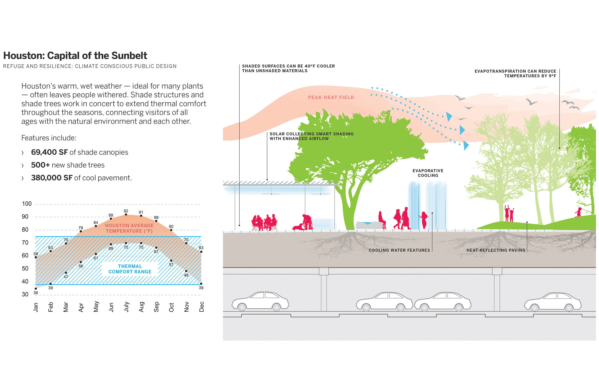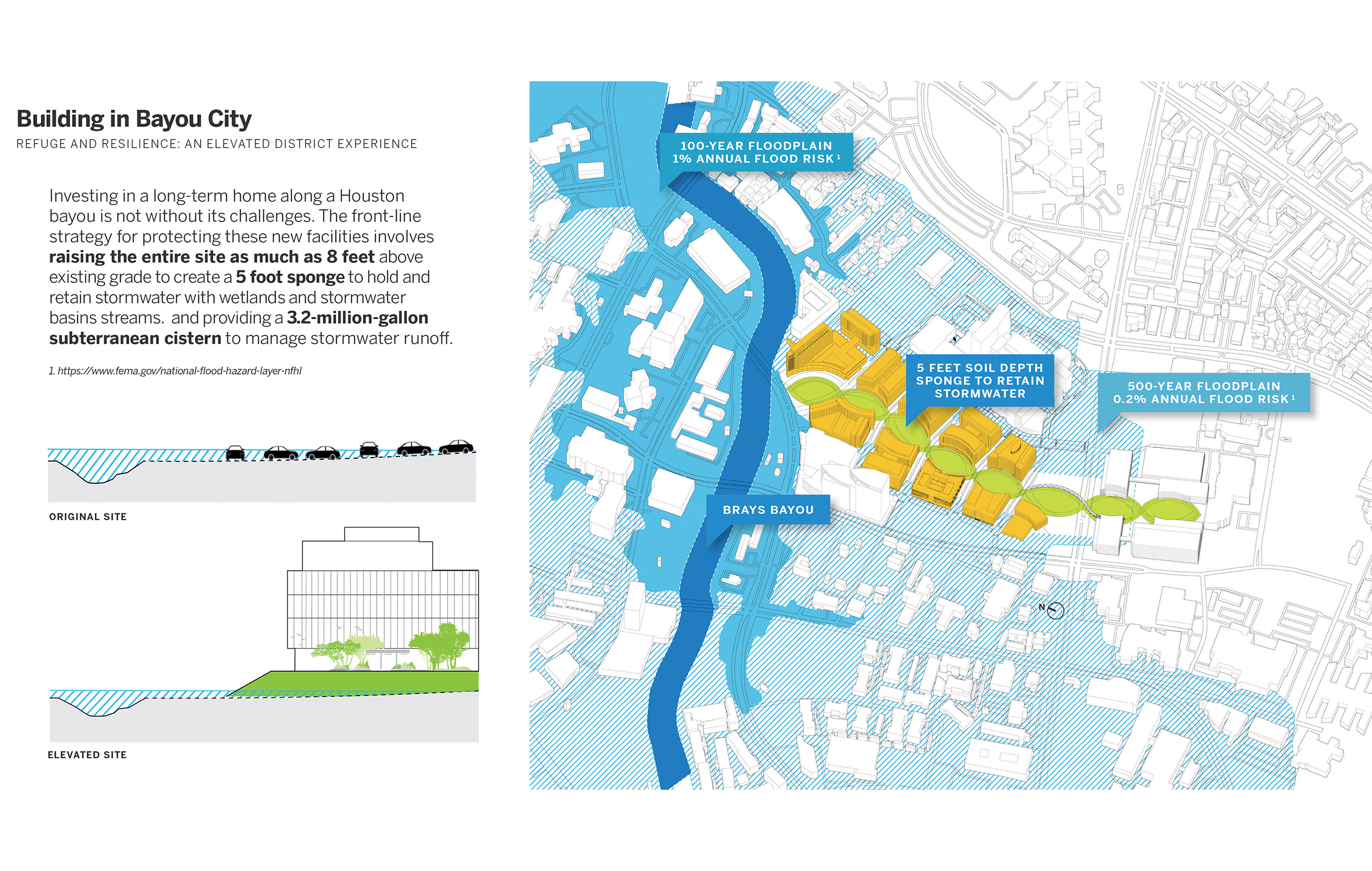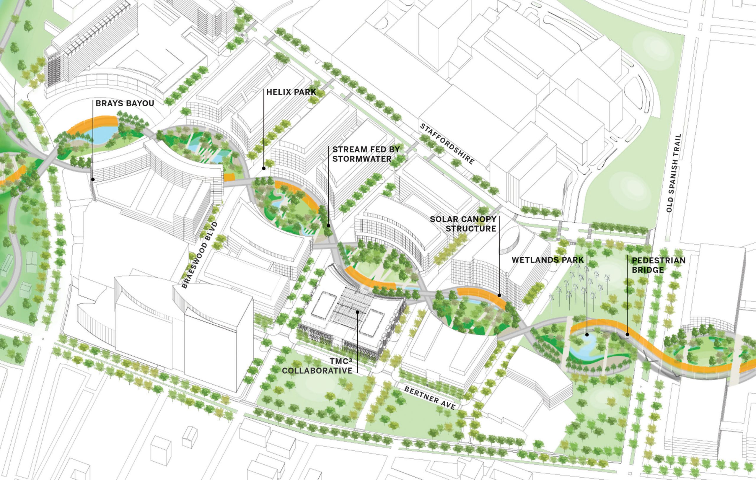 Houston’s Texas Medical Center is the largest medical complex in the world, and this new 42-acre translational research campus envisioned from the south of Brays Bayou represents a groundbreaking approach to resiliency and sustainability in the region. Given that flooding from the concretized bayou poses a significant threat to the site, the plan integrates a holistic strategy to mitigate flash flooding from major storm events for a more resilient strategy. Developed with Elkus Manfredi, a significant investments in the public realm creates a welcoming mixed-use urban district, organized around a green necklace that connects the Bayou to Old Spanish Trail. This comprehensive strategy involves sustainable construction practices and elevating the entire 42-acre site to enhance its capacity to manage storms and maintain resiliency across the district.